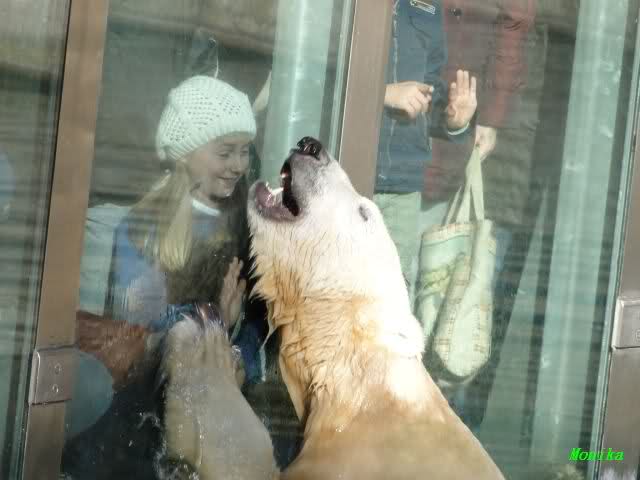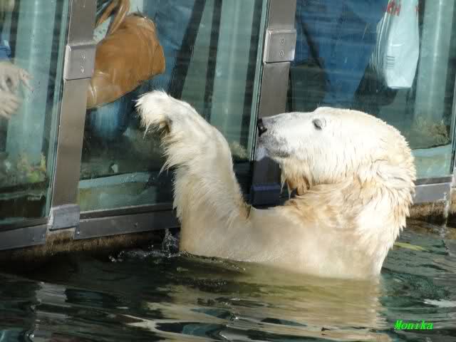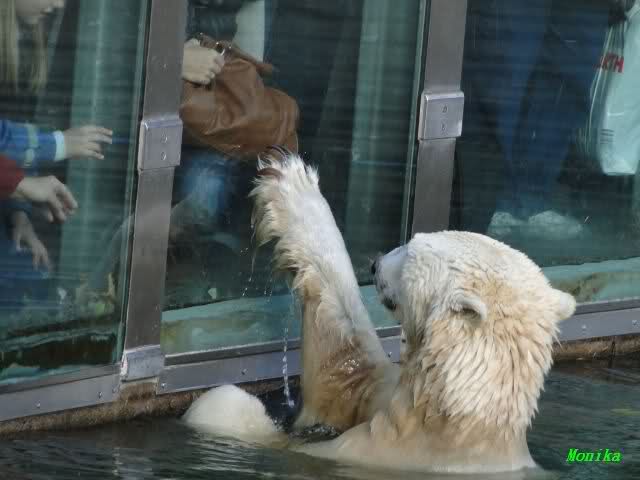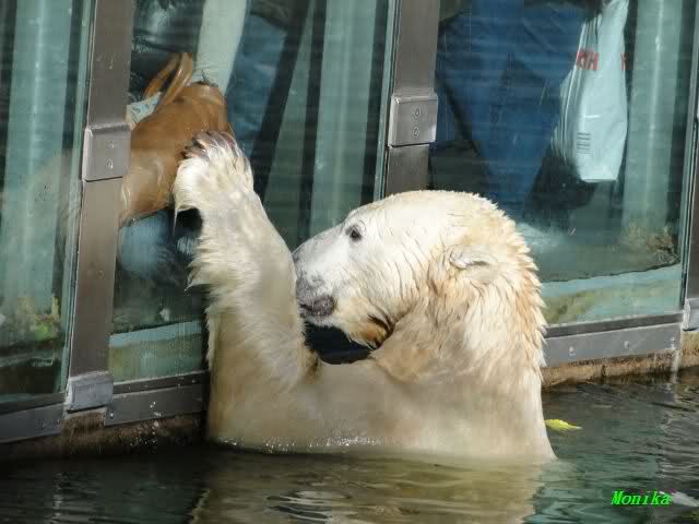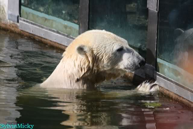 Mittags kam eine treue Knutfreundin, die aus Holland angereist war. Sie wünschte sich, dass sich Knut in den nächsten Tagen einmal an der Scheibe zeigt. Keine 5 Minuten später ging Knut ins Wasser und erfüllte dem Gast heute schon den Wunsch. Ja er weiß eben, was er seinen Fans schuldig ist.