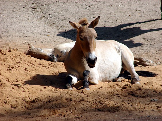 Das hab ich bei den Przewalskis auch noch nie gesehen, anscheinend hat so ein Sandhaufen kühlende Wirkung. Als ich ankam, lagen beide flach, aber man musste dann doch mal schauen, wer da ans Gehege kommt