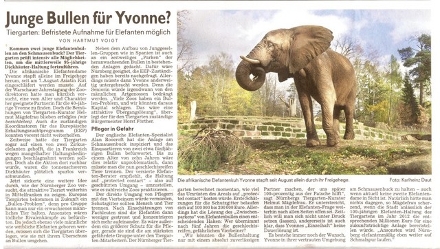 Ich habe heut früh ziemlich dumm geschaut, als ich das in der Zeitung gelesen habe, ich weiß momentan nicht recht, was ich davon halten soll. Mein erster Gedanke war, dass ich keine Jungbullen in Nürnberg sehen will, sondern Yvonne mit einer neuen Partnerin. Das scheint sich aber wirklich sehr schwierig zu gestalten, an Bemühungen hat es wohl bisher nicht gemangelt. Ich denke der Tiergarten lotet einfach die Möglichkeiten aus. In der NZ war heute auch ein Artikel, in dem nun auch Herr Mägdefrau mit dem Argument kommt, das schon gleich nach Kiris Tod aus den Reihen der Politik kam, nämlich was passiert, wenn wieder eine der alten Kühe stirbt. Nachzulesen hier: