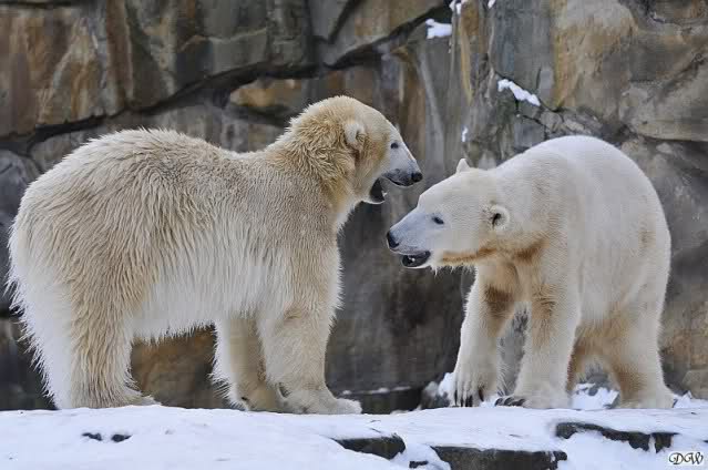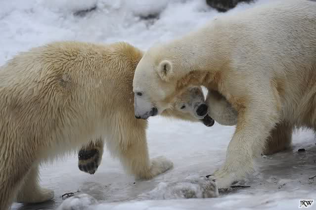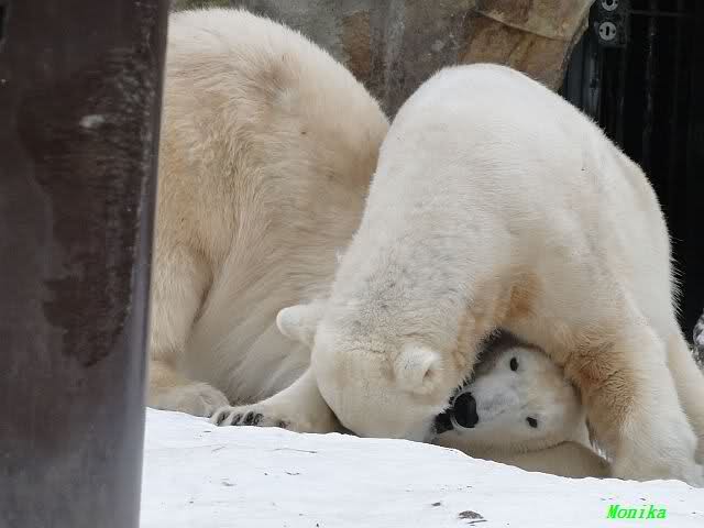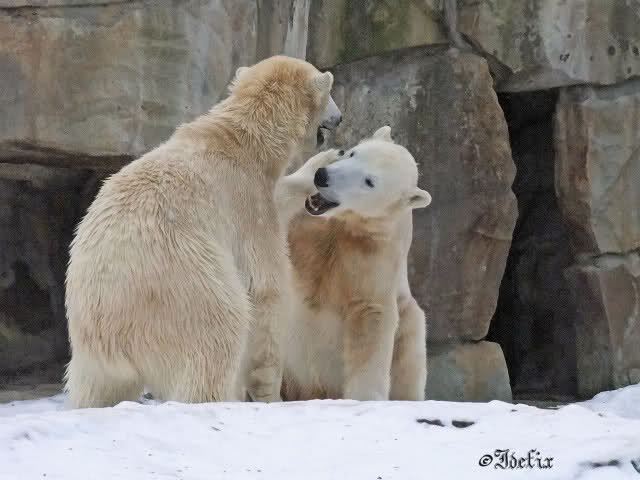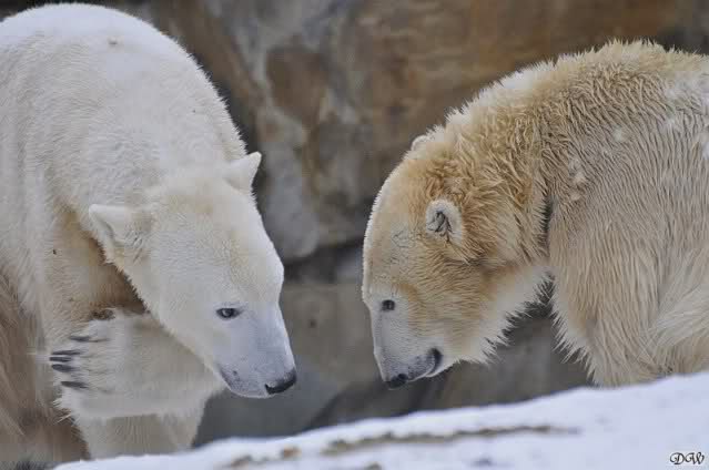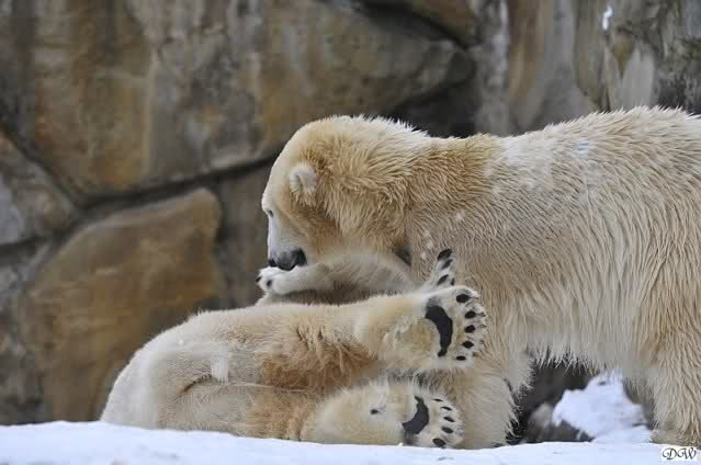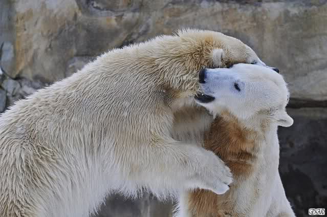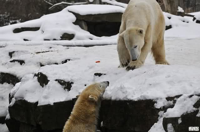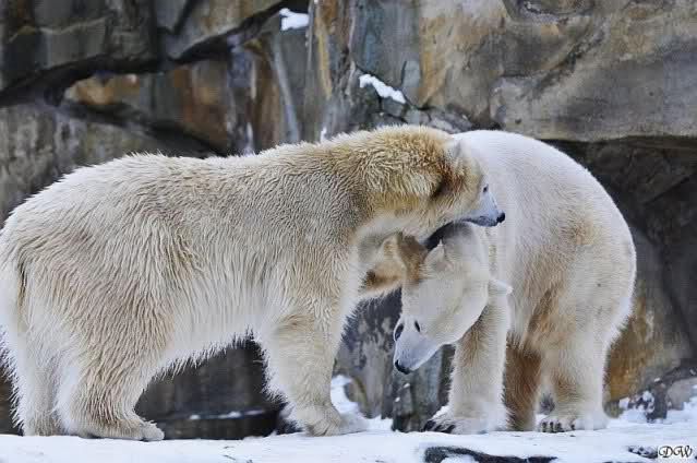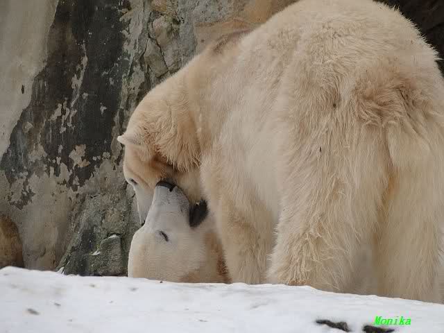 Wieder ein angenehmer Nachmittag mit zwei wunderschönen Bären. Das Power-Girl zog einmal mehr alle Register. Und, wir sahen einen seligen Knut. Gianna spielte lange Zeit mit ihm und die Gesichter der Beiden beim Spielen und Raufen sind rührend anzusehen. Die kleinen Blutspuren auf ihrem und seinem Fell stammen nicht von einer raufbedingten Verletzung sondern von Knut’s Tatze, die blutete.