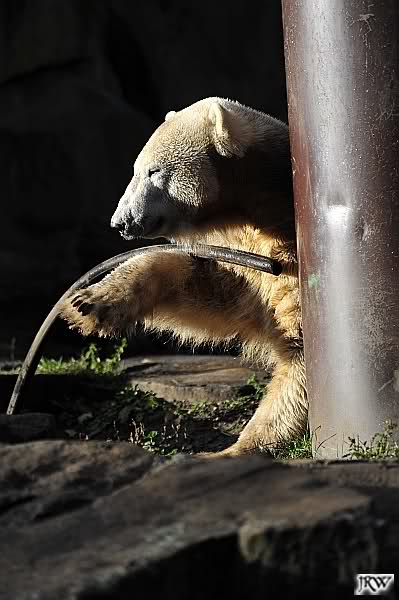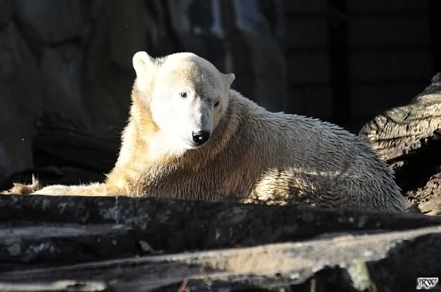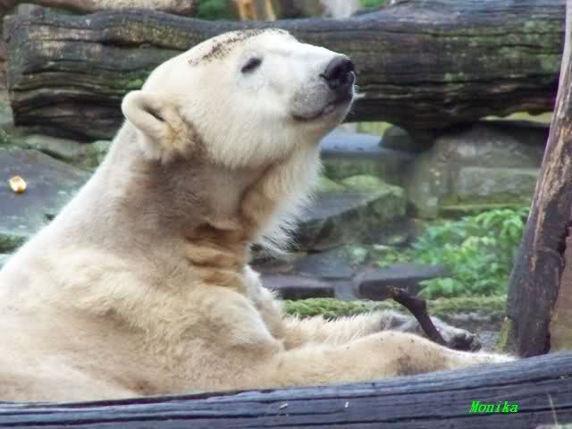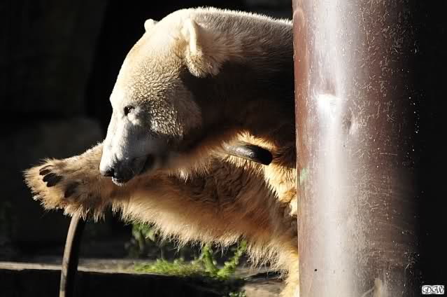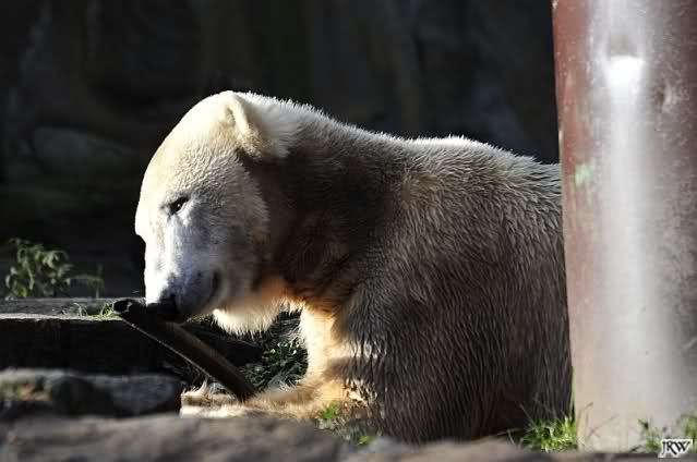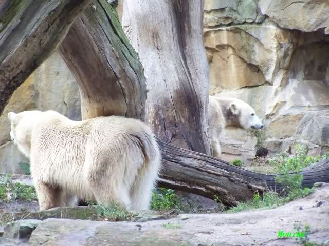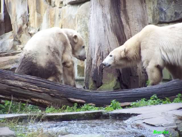 Gianna war im Wasser und Knut hat von oben zugeschaut. Gianna stellte sich im Wasser auf und Knut kam immer näher. Sie haben sich fast mit der Nase berührt und Gianna berührte Knut mit der Pfote. Das sah sehr niedlich aus. Leider war meine Kamera wieder zu langsam, um diesen Augenblick festzuhalten. Aber ich bin mir sicher, wir werden hier heute noch einige Fotos davon zu sehen bekommen.