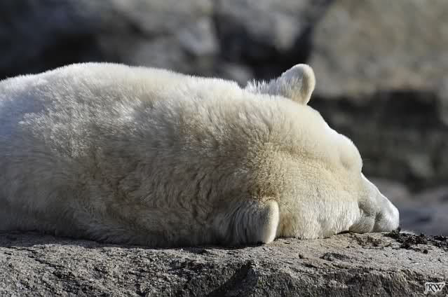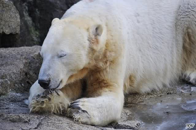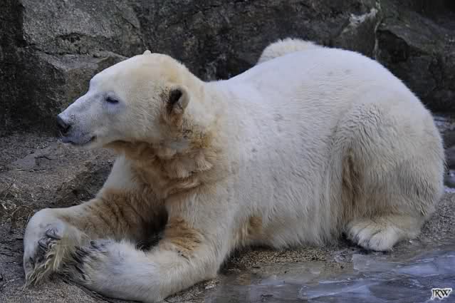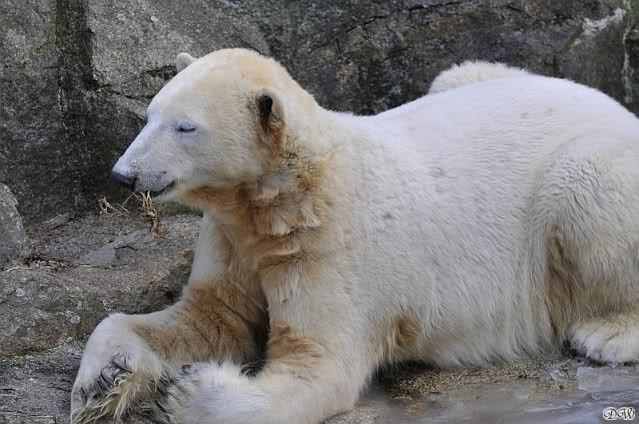 Ich war nach der Fütterung im Zoo. Knut lag auf der linken Insel. Da lag er bis die Drei rein gingen. Er nahm verschiedene unbequeme Liegestellungen ein.