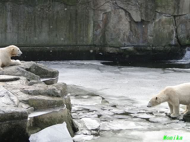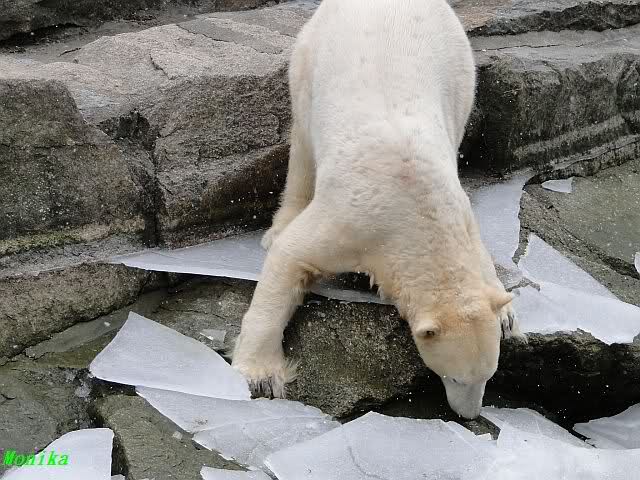 Heute Morgen war es sehr kalt und schneite leicht. Es hat sich eine dicke Eisschicht im Wassergraben des Eisbären-Geheges gebildet. Es wurde schon viel Wasser abgelassen und später wieder zugelassen, damit sich die Eisschicht auflöst.