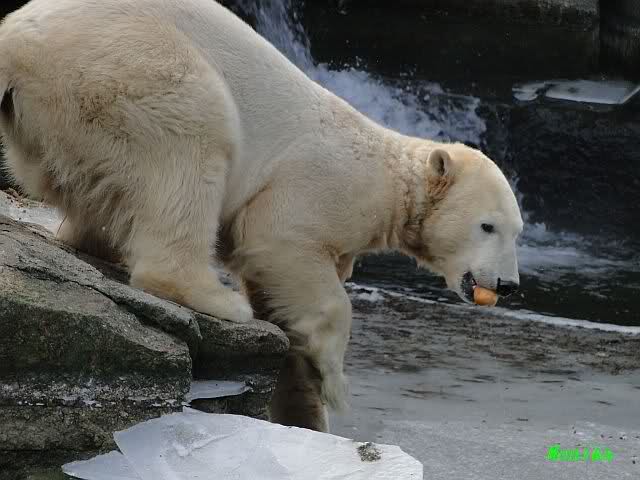Bei der Fütterung kamen die Mädels Knut sehr nahe, was ihm heute gar nicht gefiel. Das Fleisch fiel meist auf das Eis und auch das gefiel ihm nicht. Also trabte er ganz nach hinten in die Ecke und wartete dort. Frau Weckert rief Knut einige Male laut, aber er kam nicht. Damit er auch noch etwas abbekommt, hatte sie ein Einsehen und folgte Knut nach hinten.