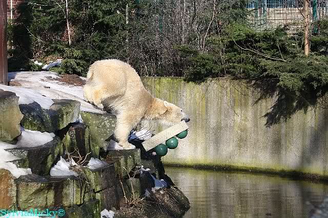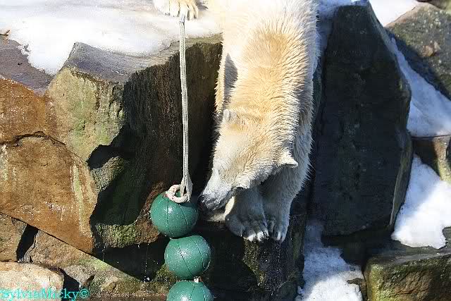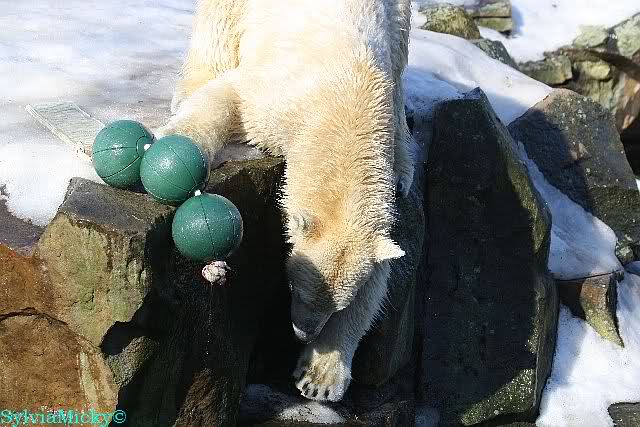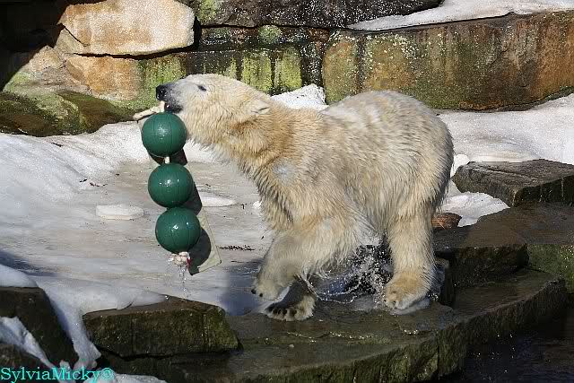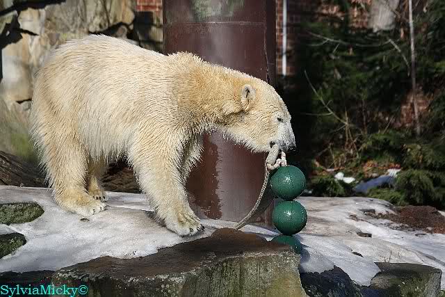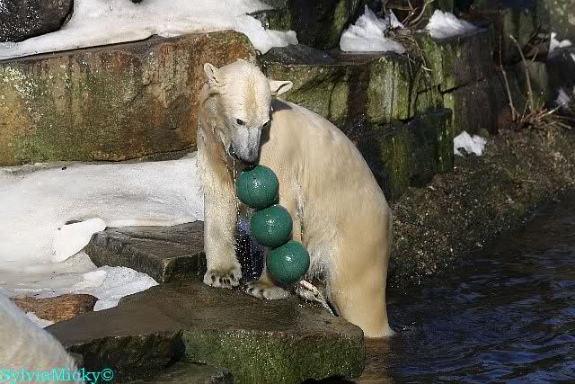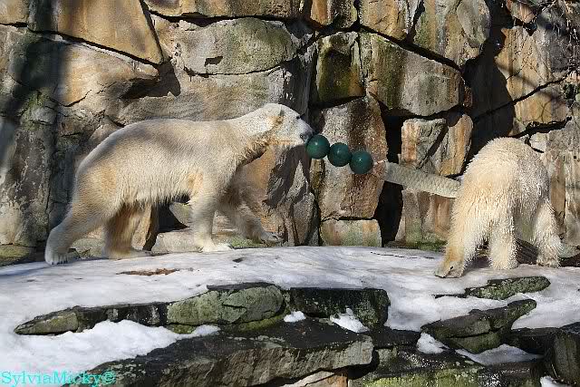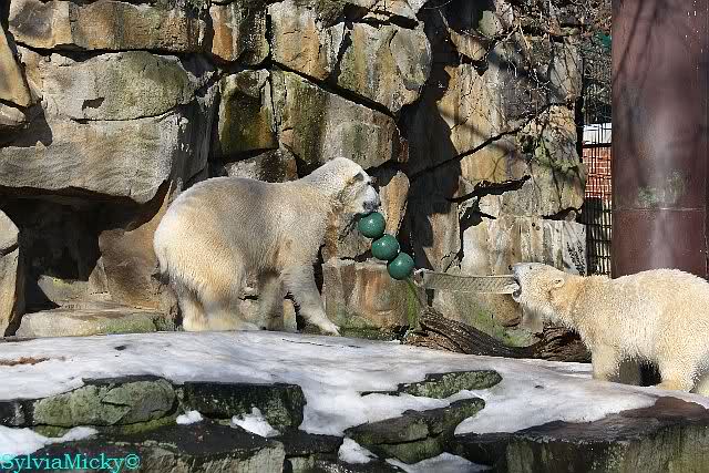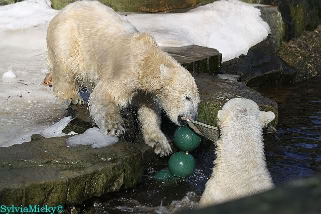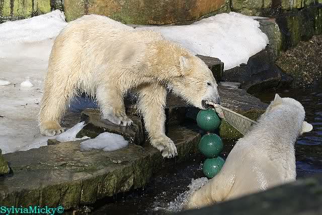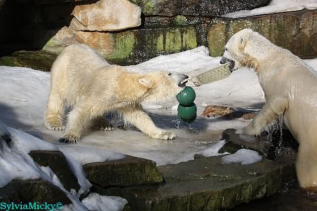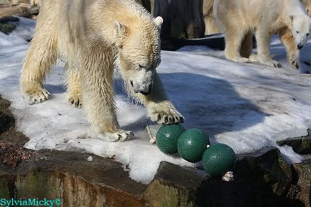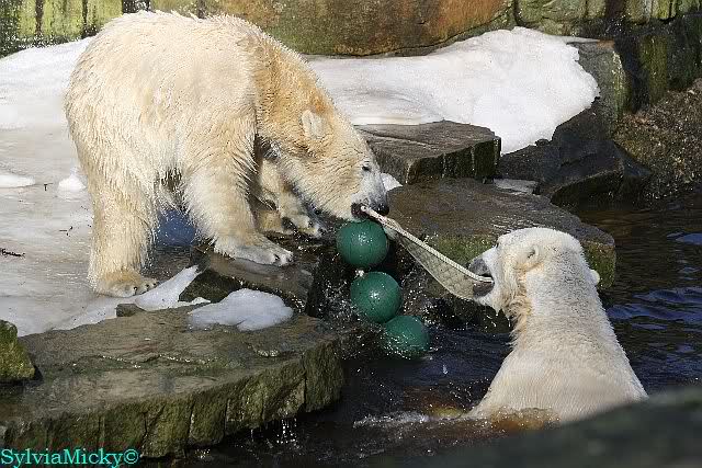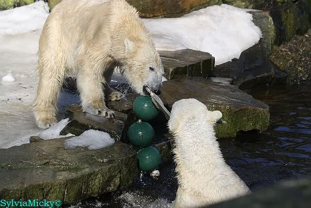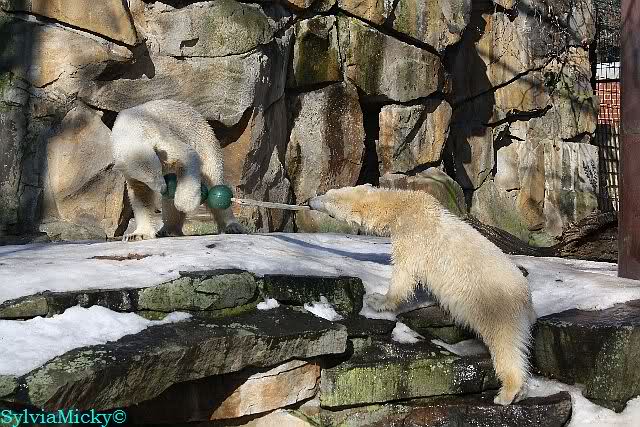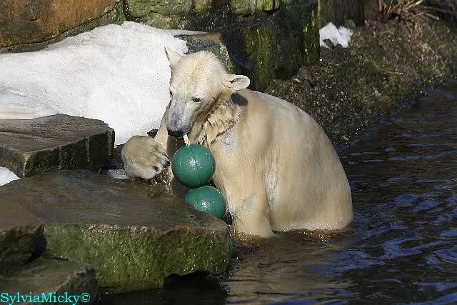 Bei herrlichem Sonnenschein und Temperaturen um die 7° spielten beide Bären am Vormittag ausgelassen im Wasser und mit den Pflanzkugeln. Mal hatte Knut sie, mal Gianna. Dann gab es wieder Tauziehen, wo mal Knut und mal Gianna gewann.