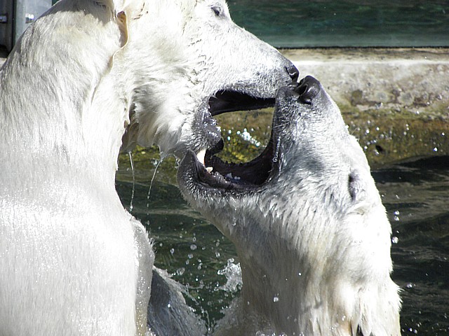 Wir besuchten dann nochmal Flocke und Rasputin und trauten unseren Augen kaum: Flocke hatte sich aufgerafft und war im Wassser, Rasputin natürlich auch. Die beiden waren ganz aufgedreht, tollten im Wasser herum, waren oft an den Scheiben bei den Zuschauern.