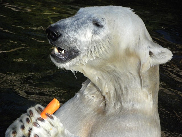 Bei der Fütterung war Rasputin zuerst in der Höhle verschwunden, wahrscheinlich hat er drinnen schon etwas bekommen. Der Pfleger, der Flocke fütterte, warf das Futter (Fleisch, Rüben, Fische, Salat ...) in das Gehege, so dass es schön verteilt war. Er wartete immer, bis Flocke in aller Ruhe hätte fressen können.