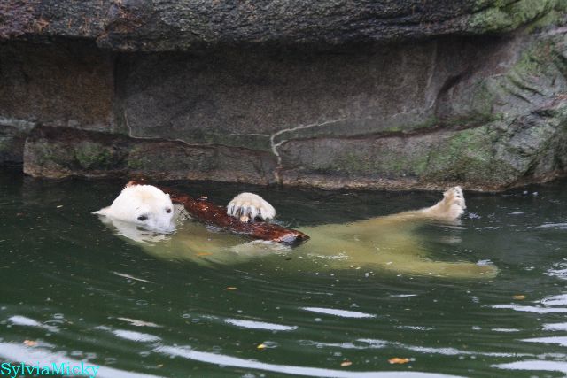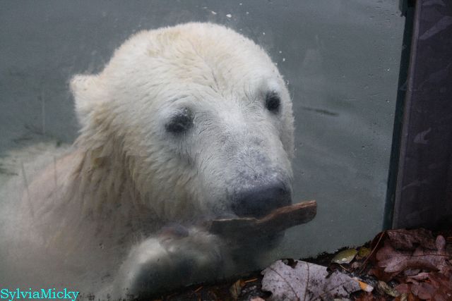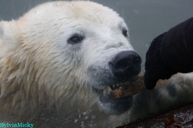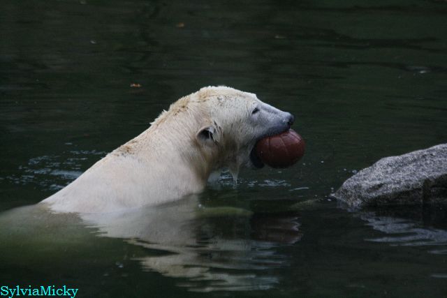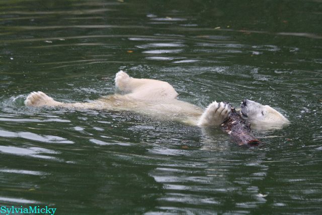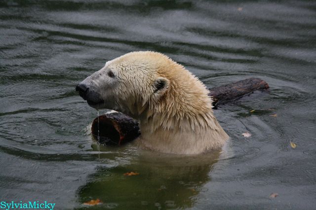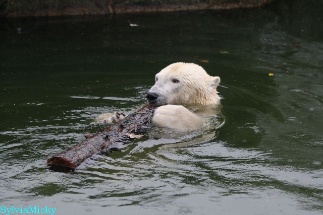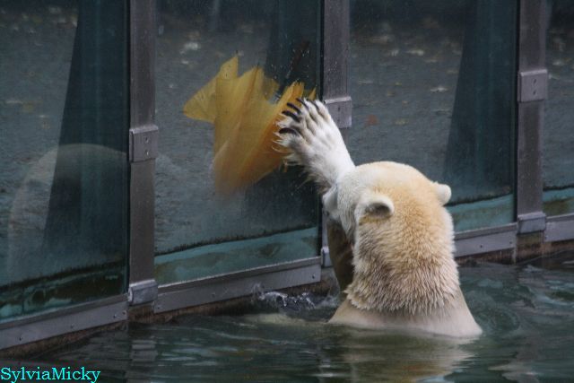 Heute früh war Knut schon im Wasser. Er spielte wieder mit einem Beschäftigungszweiglein, welches er auch den Besuchern zeigte. Man sah ihm an, wie sehr er den großen Pool genoß.