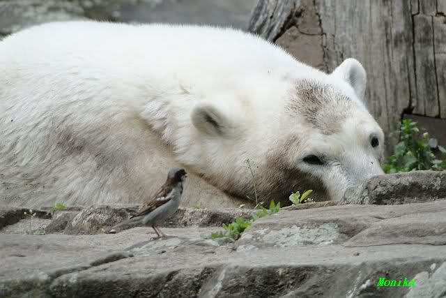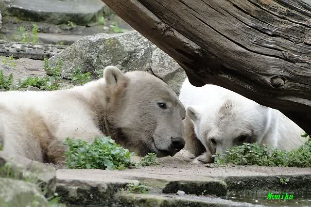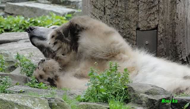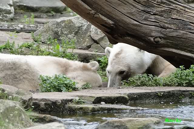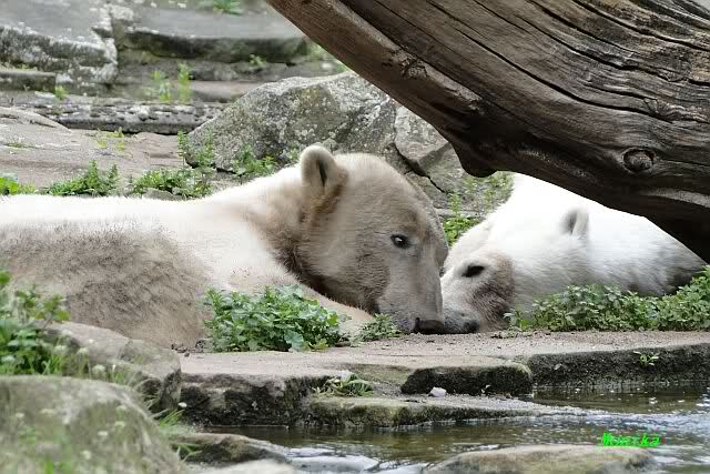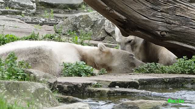 Den heutigen Vormittag kann man mit zwei Worten beschreiben: Müde Bären. Es wurde viel geschlafen. Zweimal ist Gianna ganz dicht zu Knut gerückt und hat ihn beim schlafen beobachtet. Er war so müde, dass er nicht mal aufgestanden ist.