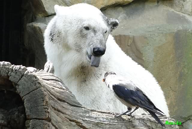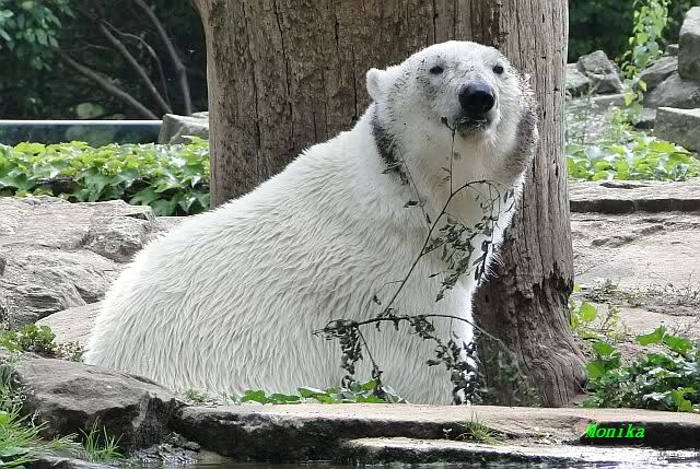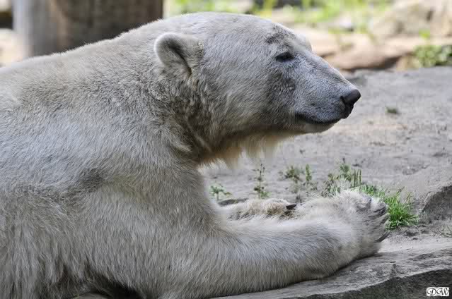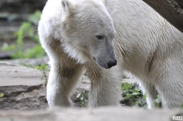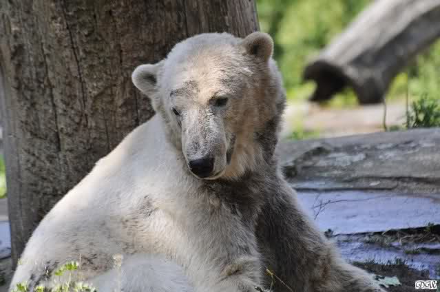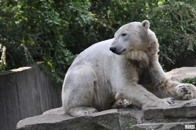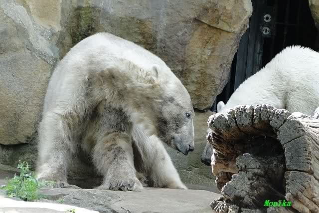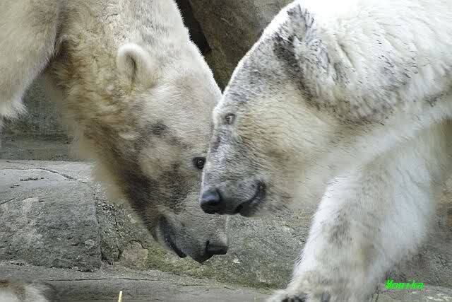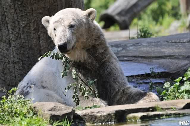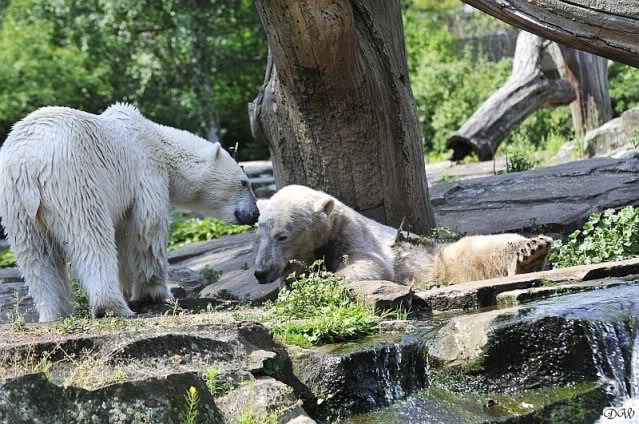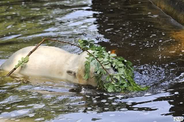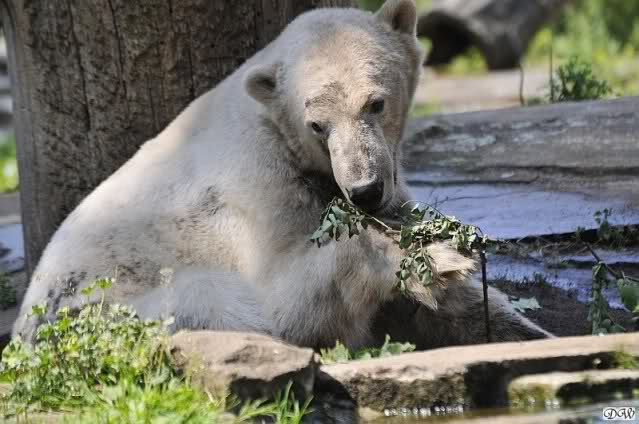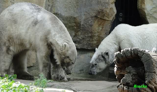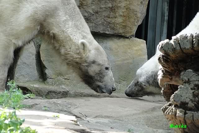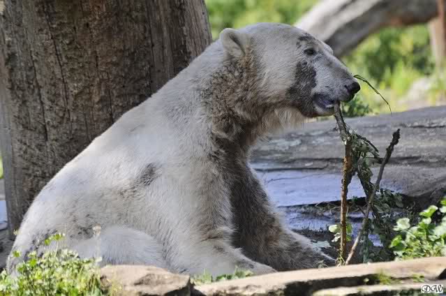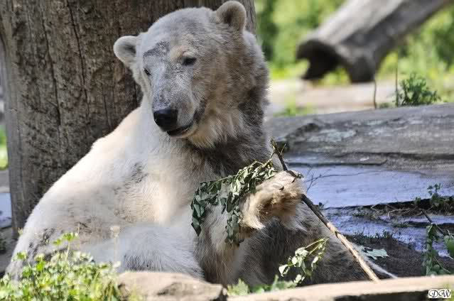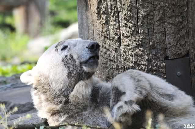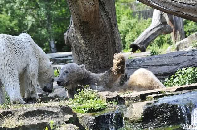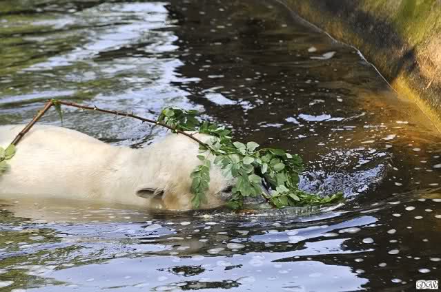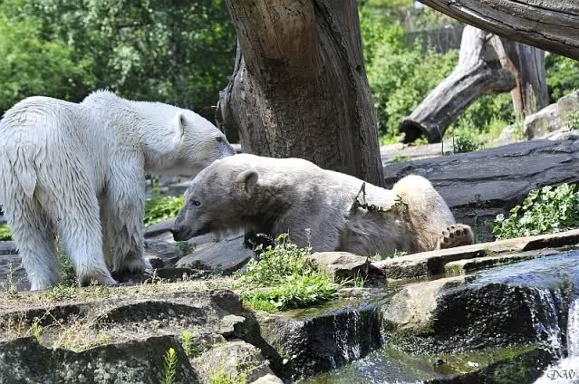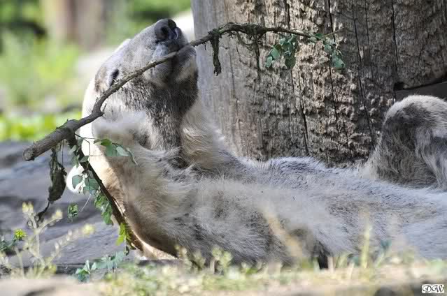 Da meine Wohnung derzeit einer Sauna gleicht, bin ich am Spätnachmittag noch einmal in den Zoo gegangen. Leider hat Knut dann nicht mehr mit dem Ball gespielt. Er war nämlich müde. Er schlief und Gianna friemelte mit dem Zweig. Sie suchte aber auch immer wieder seine Nähe. Manchmal ließ er es zu, aber er zeigte ihr auch mal die Lippe.