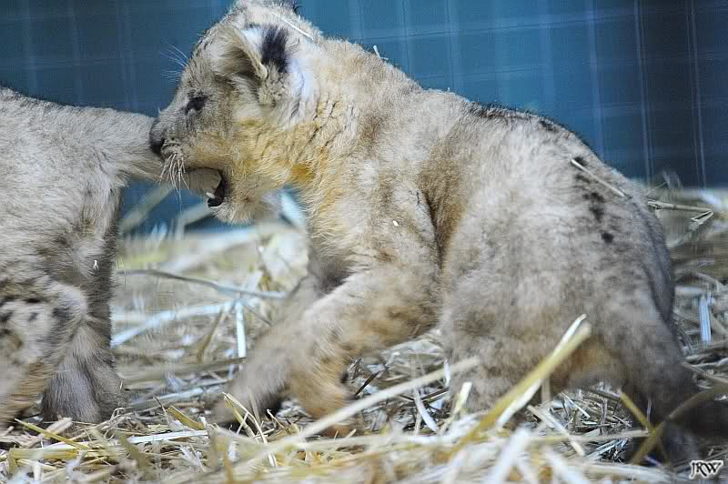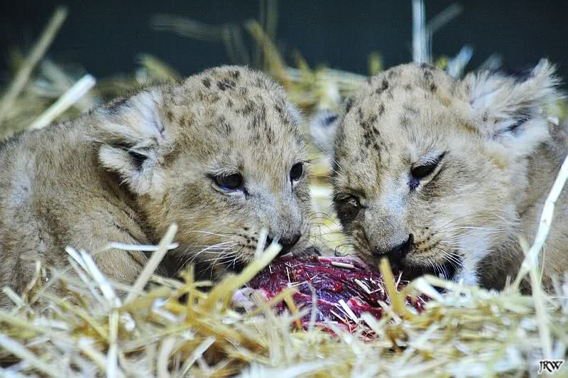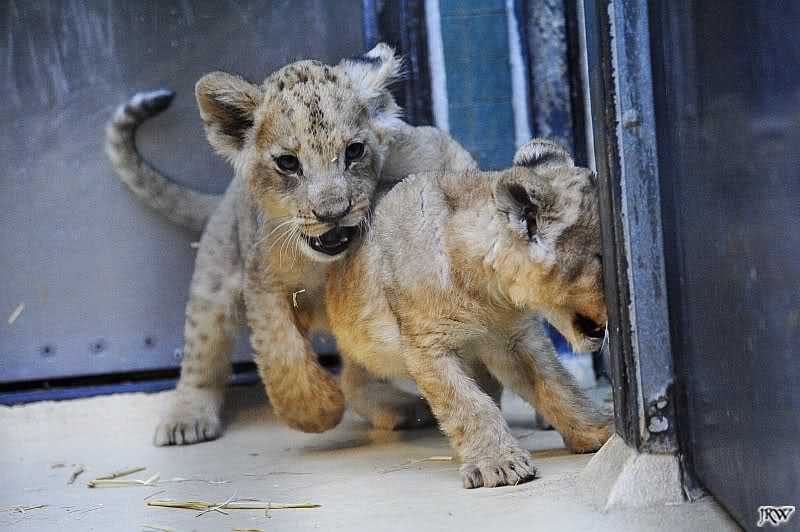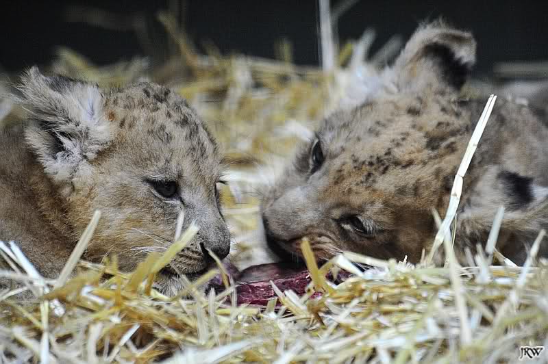 Die Namen der kleinen Löwen wurden heute bekanntgegeben. Das Mädchen heißt Eringa und der kleine Junge Bomani. Die Zufütterung bekommt den Kleinen ausgezeichnet. In den letzten Wochen konnte man die Bäuchlein wachsen sehen und sie sind so energiegeladen wie nie zuvor. Ständig „kämpfen“ sie um etwas. Entweder das Fleisch, die Kordel, die im Käfig hängt oder aber ganz einfach um herauszufinden wer am Stärksten ist. Wäre nicht die Furcht vor ihrer Zukunft, wäre es eine Riesenfreude ihnen zuzusehen. Sie sind wunderschön und drollig dazu.