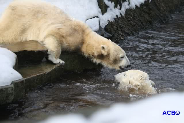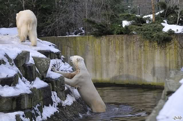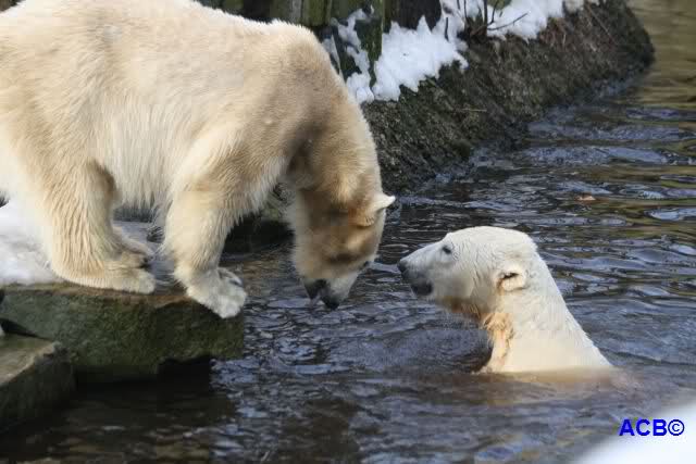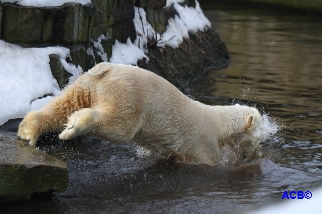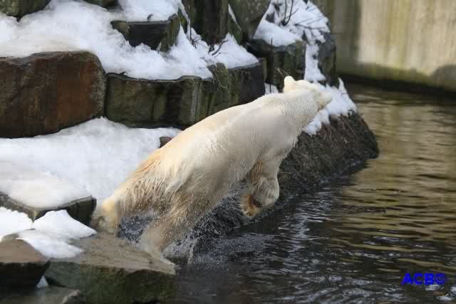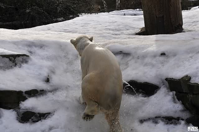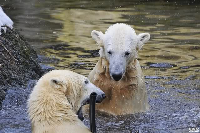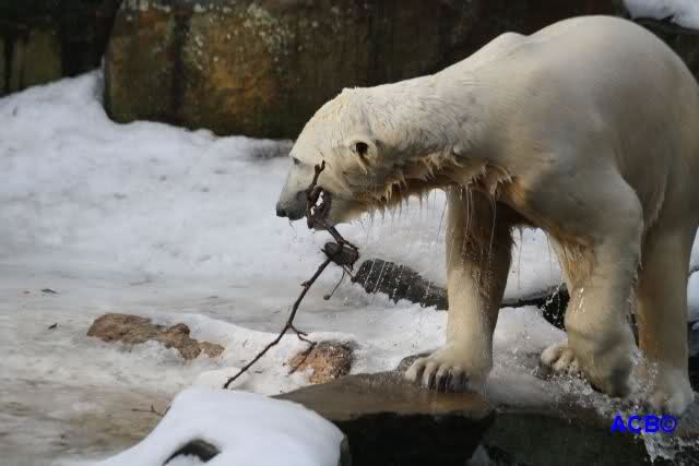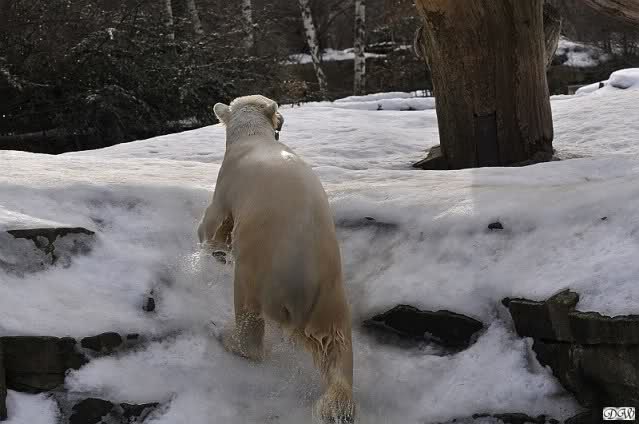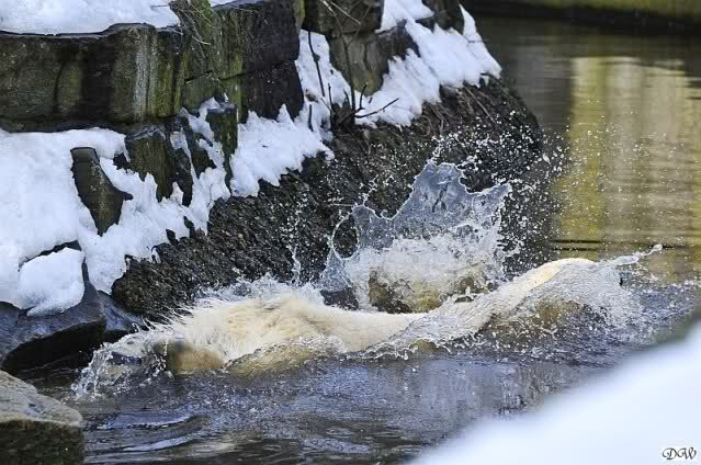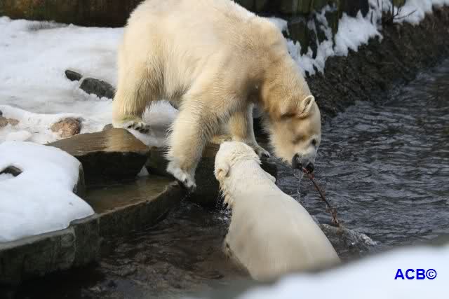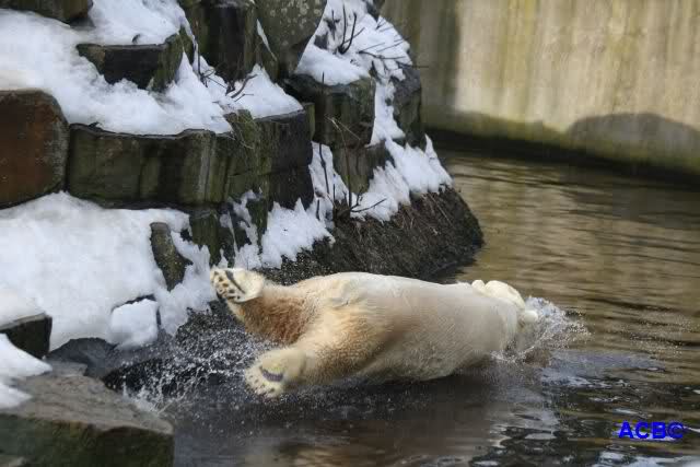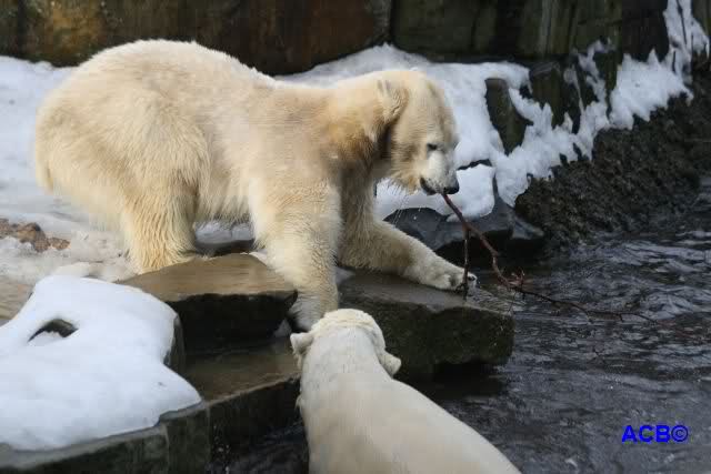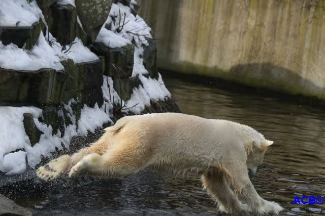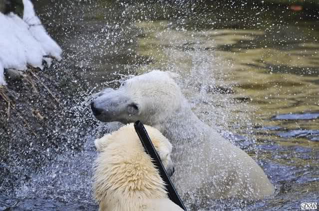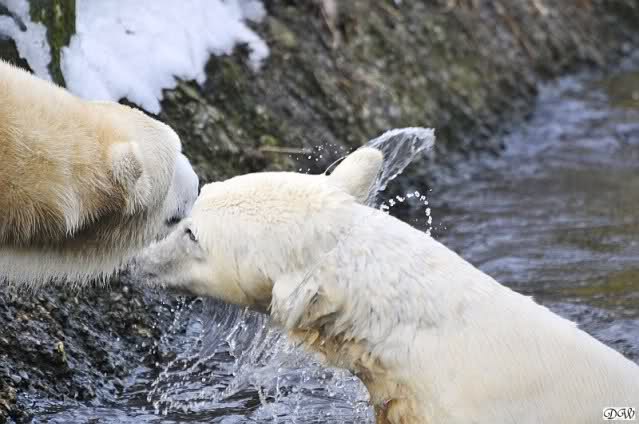 Lebensfreude pur! Anders kann man Knut heute nicht beschreiben. Nicht nur die Besucher kamen aus dem Staunen nicht heraus, sondern auch Gianna schien sich zu fragen was heute in ihn gefahren ist. Knut tobte über die Anlage, sprang ins Wasser, spielte dort, raste die vereiste Anlage hoch. Ja, Ihr habt richtig gelesen, er raste die Anlage hinauf. Gianna spielte anfangs zögernd mit, rannte sogar vor ihm davon. Knut raste hinterher, sie sprang ins Wasser und er sofort hinterher. Manchmal wusste man nicht, wo man nun hinsehen soll. Sie waren beide so bezaubernd. Sie tobten im Wasser, sie nahm ihm sein Stöckchen weg, er raste hinterher und holte es wieder. So ging es wieder und wieder. Einfach toll anzusehen.
