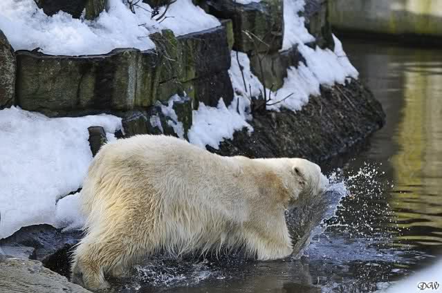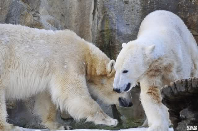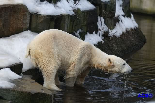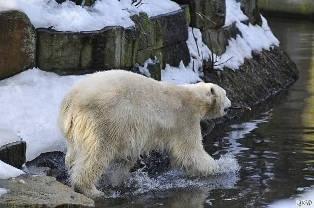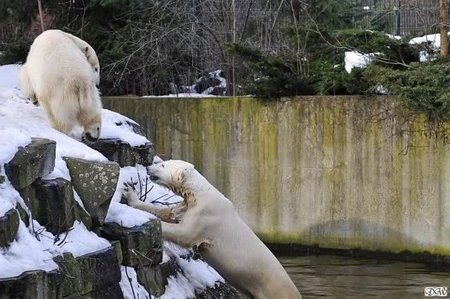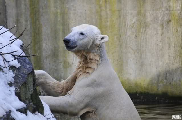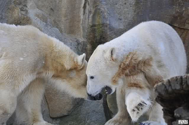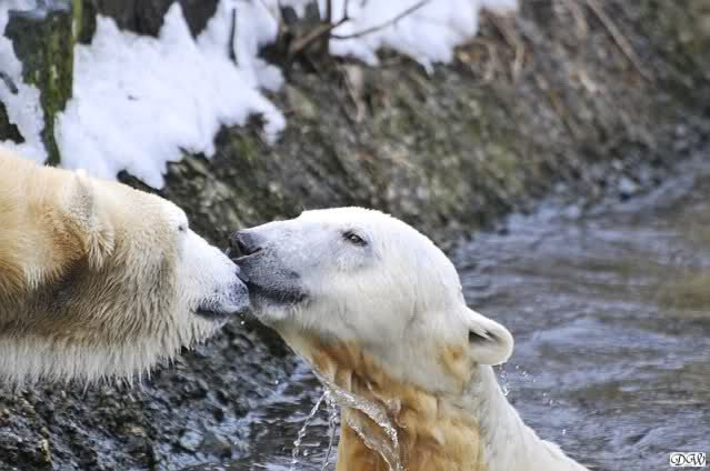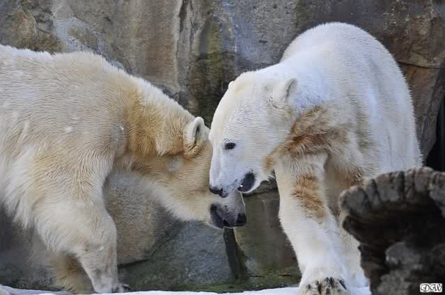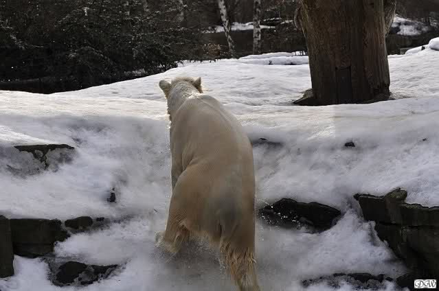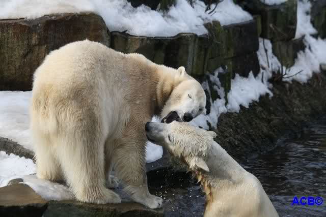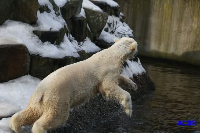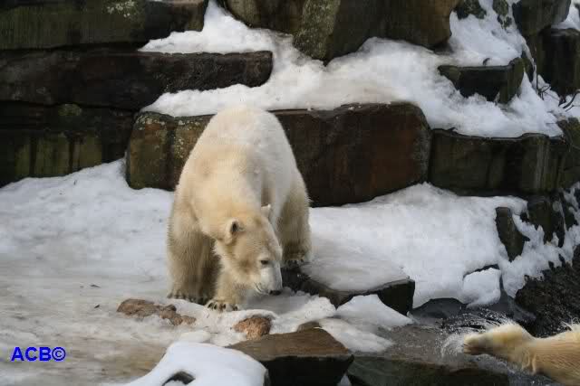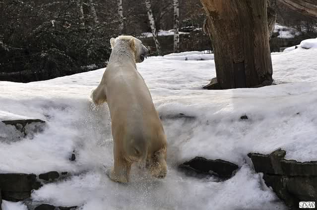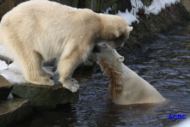 Lebensfreude pur! Anders kann man Knut heute nicht beschreiben. Nicht nur die Besucher kamen aus dem Staunen nicht heraus, sondern auch Gianna schien sich zu fragen was heute in ihn gefahren ist. Knut tobte über die Anlage, sprang ins Wasser, spielte dort, raste die vereiste Anlage hoch. Ja, Ihr habt richtig gelesen, er raste die Anlage hinauf. Gianna spielte anfangs zögernd mit, rannte sogar vor ihm davon. Knut raste hinterher, sie sprang ins Wasser und er sofort hinterher. Manchmal wusste man nicht, wo man nun hinsehen soll. Sie waren beide so bezaubernd. Sie tobten im Wasser, sie nahm ihm sein Stöckchen weg, er raste hinterher und holte es wieder. So ging es wieder und wieder. Einfach toll anzusehen.