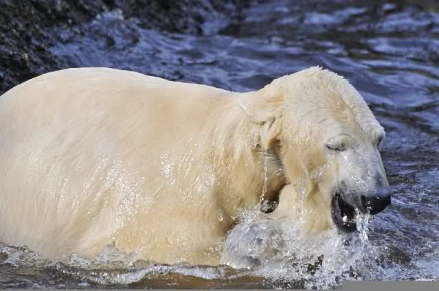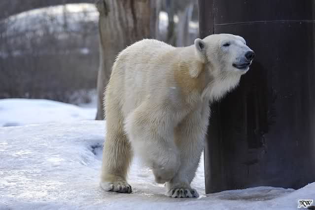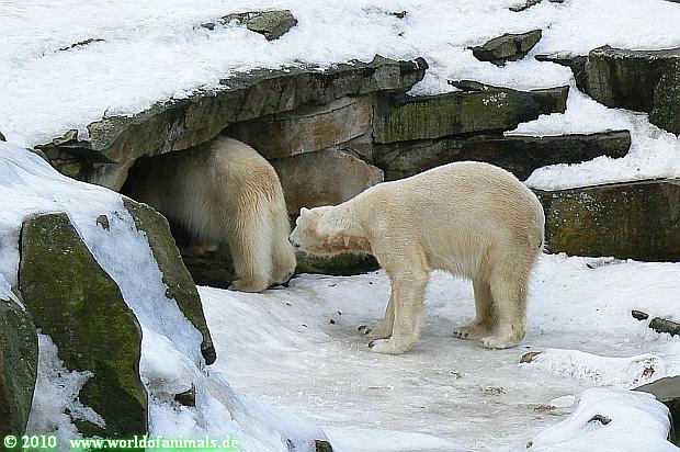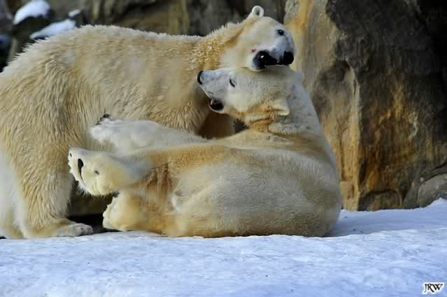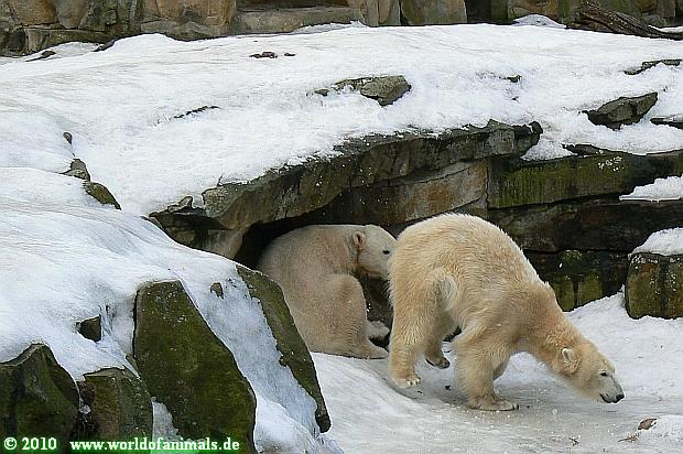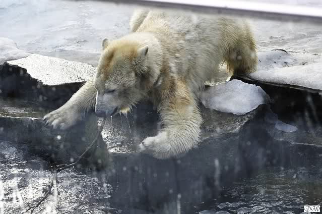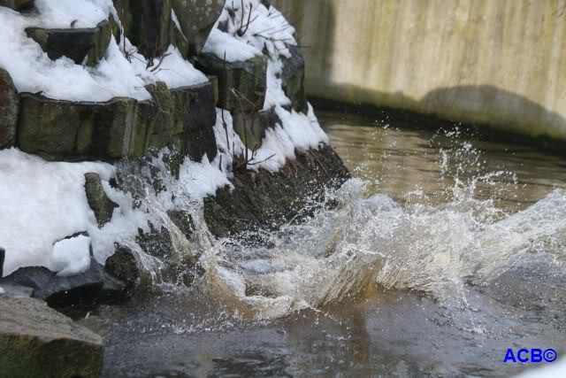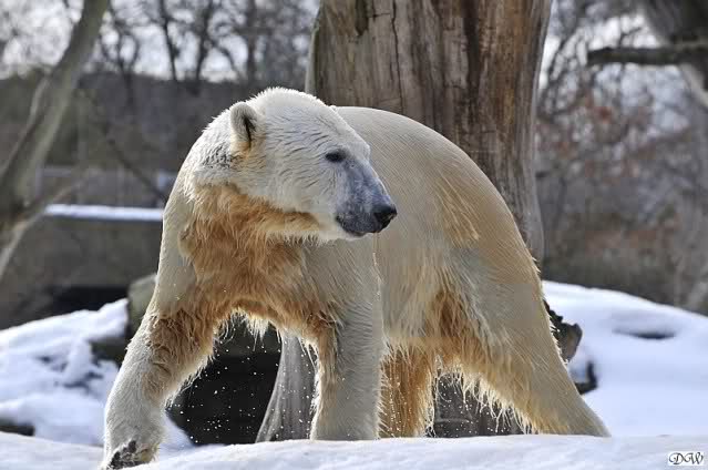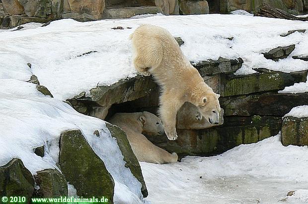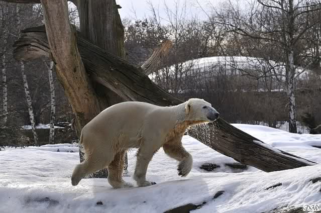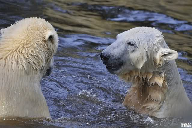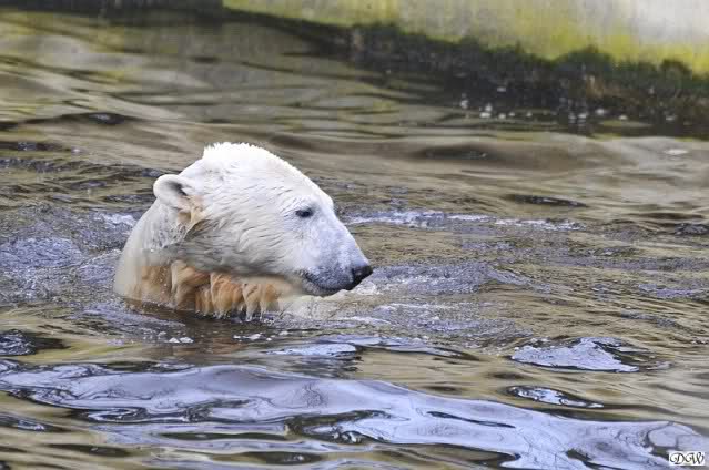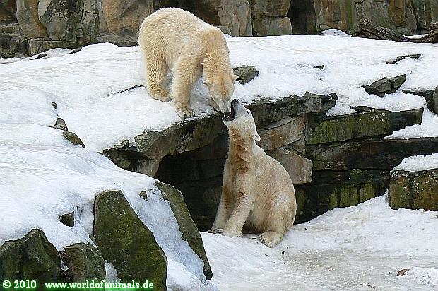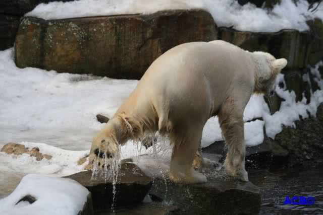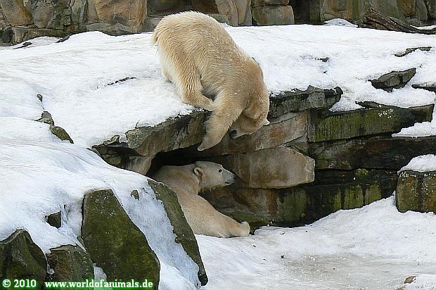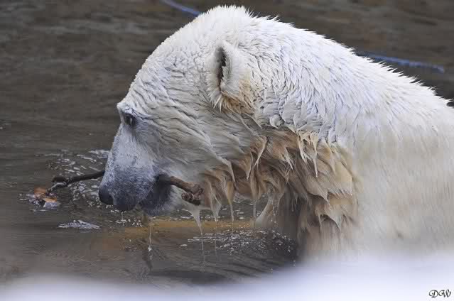 Lebensfreude pur! Anders kann man Knut heute nicht beschreiben. Nicht nur die Besucher kamen aus dem Staunen nicht heraus, sondern auch Gianna schien sich zu fragen was heute in ihn gefahren ist. Knut tobte über die Anlage, sprang ins Wasser, spielte dort, raste die vereiste Anlage hoch. Ja, Ihr habt richtig gelesen, er raste die Anlage hinauf. Gianna spielte anfangs zögernd mit, rannte sogar vor ihm davon. Knut raste hinterher, sie sprang ins Wasser und er sofort hinterher. Manchmal wusste man nicht, wo man nun hinsehen soll. Sie waren beide so bezaubernd. Sie tobten im Wasser, sie nahm ihm sein Stöckchen weg, er raste hinterher und holte es wieder. So ging es wieder und wieder. Einfach toll anzusehen.