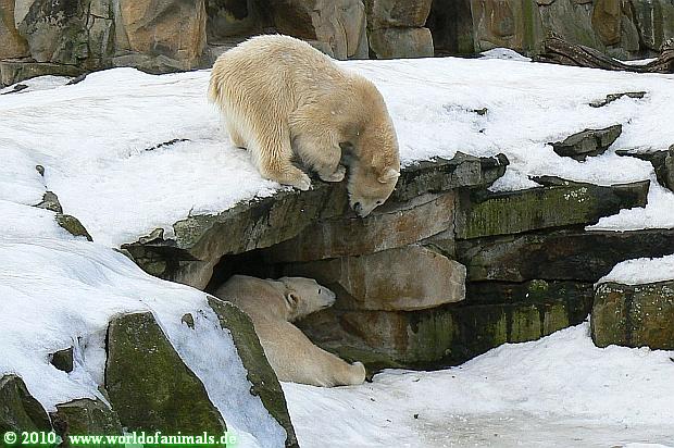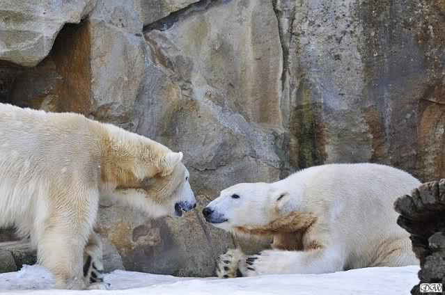 Heute Vormittag war es einmal umgekehrt. Gianna schlief und Knut ging ganz vorsichtig gucken, ob sie denn nun endlich wach wird. Aber in großer Spiellaune war Gianna dann nicht. Knut versuchte wieder alles um ihre Aufmerksamkeit zu bekommen. Er legte sich hin und machte verschiedene Yoga-Übungen, setzte sich vor den Höhleneingang, so dass Gianna nicht mehr rein kam. Ab und zu ließ sie sich dann erweichen und sie schmusten ein wenig. Ansonsten war es ein eher ruhiger Vormittag.