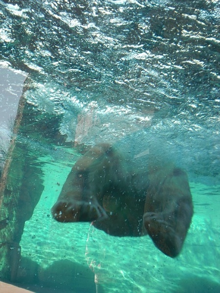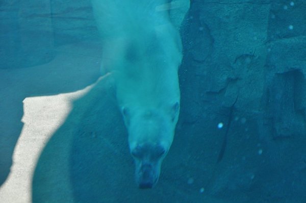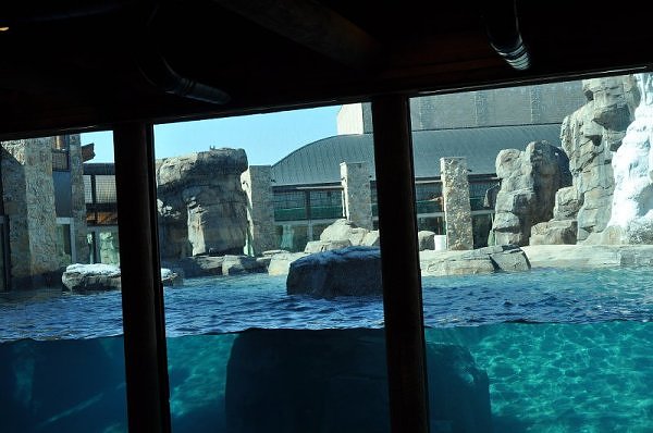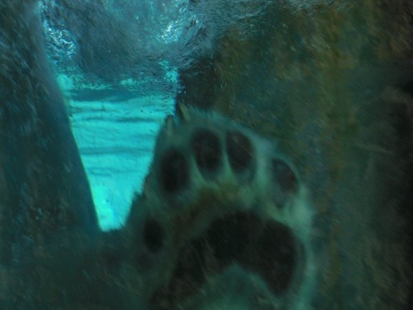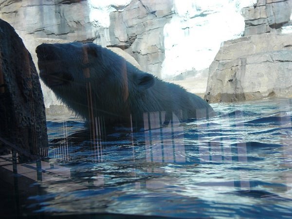 Das Gehege besteht aus einer Tundra- und Wasserlandschaft. Das ganze Gehege ist mit Glasscheiben eingegrenzt. Das Gute daran ist, dass man Nikita direkt an der Scheibe sehen kann. Auch ist er von dem Lärm durch das Glas geschützt. Es war aber nicht möglich, gute Bilder zu machen. Es war sehr sonnig und die Scheibe spiegelt. Wir haben es nicht geschafft ein Bild von dem „ganzen“ Bären zu machen. Er ging nicht an Land. Sehr gut für die Besucher ist auch ein beheizter Raum mit Bänken. Dort kann man den Bären sehr gut und bequem beobachten. In diesem Raum saß eine Tierpflegerin und beobachtete Nikita. Ich habe sie angesprochen. Nikita soll eine Freundin bekommen, wenn er älter wird.