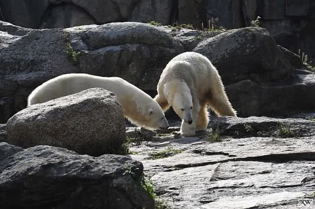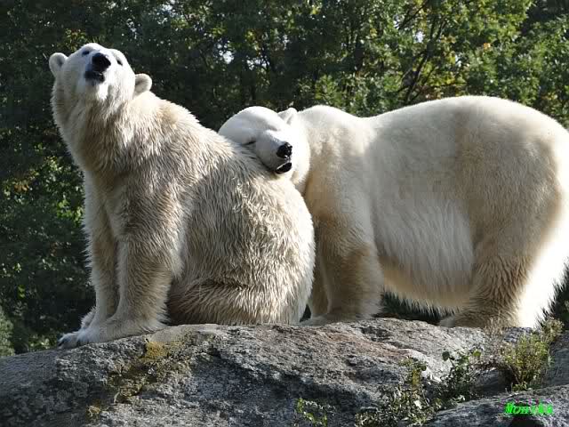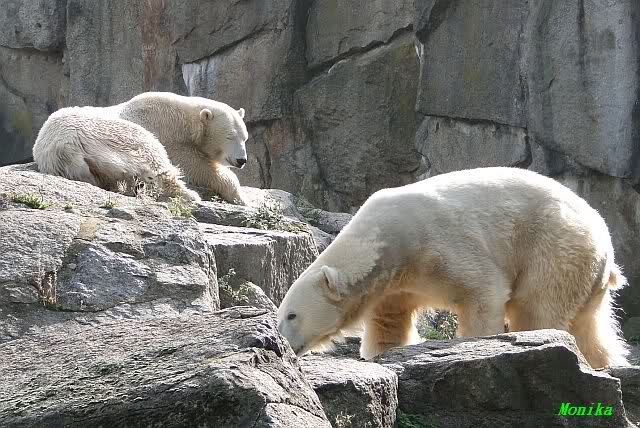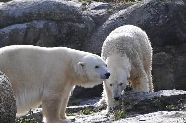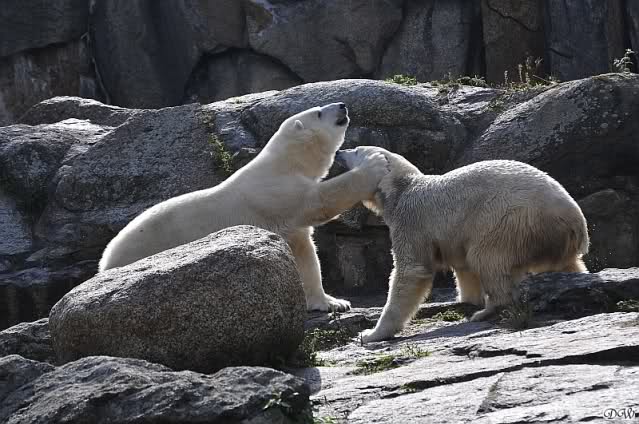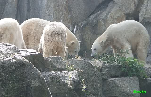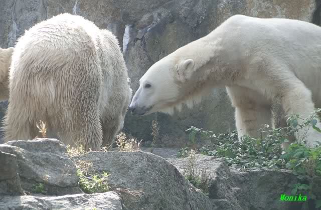 Am frühen Nachmittag lag Knut wieder auf seinem Plateau. Allerdings schien er sich nicht sonderlich wohl zu fühlen. Der Grund war, dass Tosca und Nancy direkt auf dem Felsen über ihm lagen. Immer wieder schweiften seine Blicke nach oben. Endlich standen die Beiden auf und gingen auf die Anlage. Erst wollte Knut ein wenig schlafen, entschied sich dann jedoch über die Anlage zu streifen. Sehr vorsichtig, aber immerhin. Auf einmal kam Katjuscha wie eine Dampfwalze auf ihn zu gerannt. Er brummte sehr laut und sie schlug ihn. Daraufhin biss er ihr in den Hals, aber sehr sanft. Sie rangelten noch eine Weile und dann ging Katjuscha wieder fort. Nancy und Tosca schauten eine Weile zu.