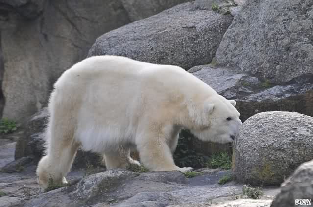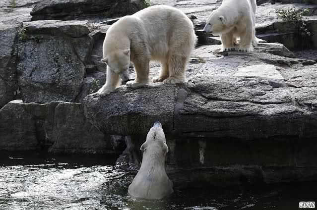 Dann kam Tosca’s Zeit! Sie war ins Wasser gegangen und fand den kleinen Ball mit dem Knut gestern schon spielte. Es war so herzerwärmend dieses Tier spielen zu sehen. Jeder, der die Bilder sieht und keine Freude dabei empfindet, hat ein echtes Problem. Während Tosca spielte, schlich Knut wieder über die Anlage und setzte sich in Kati’s Höhle. Erst als Kati nicht reagierte (sie schaute mit Nancy was Tosca machte), kam er wieder heraus und legte sich auf sein Plateau. Tosca versuchte Nancy ins Wasser zu locken, aber sie war zwar neugierig, mit dem Wasser jedoch hatte sie nichts im Sinn. Tosca kam nach langem Spielen ais dem Wasser, ging direkt zu Knut’s Plateau um zu sehen, ob sie etwas abstauben könnte. Sie konnte! Sie fand ein Grasbüschel, das Knut sich dort hingelegt hatte, und mauste es ihm. Knut war inzwischen auf die untere Kante der Felsen gelaufen und blieb dort lange Zeit. Als Tosca im Wasser spielte, war es im Nu rappelvoll an der Eisbärenanlage.