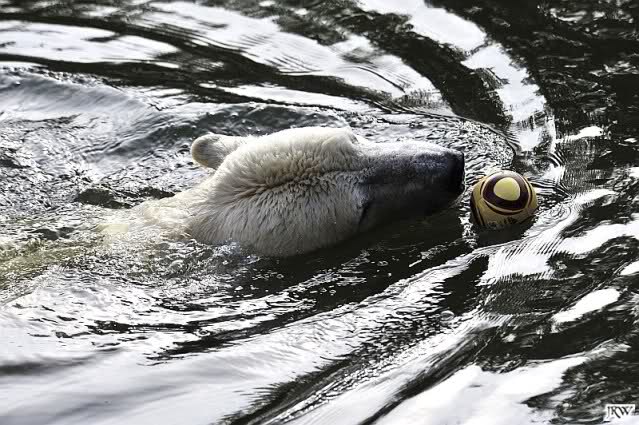 Tosca macht einen sehr glücklichen Eindruck über den gefundenen Ball und ich bin immer wieder überrascht, dass Eisbären so hingebungsvoll spielen können.