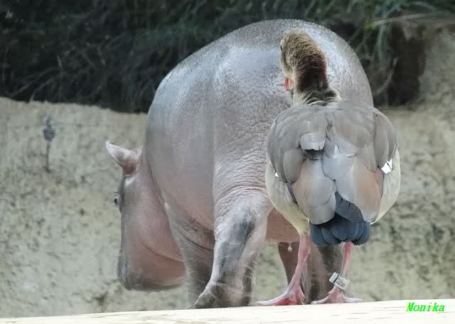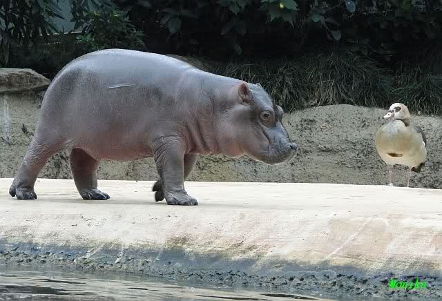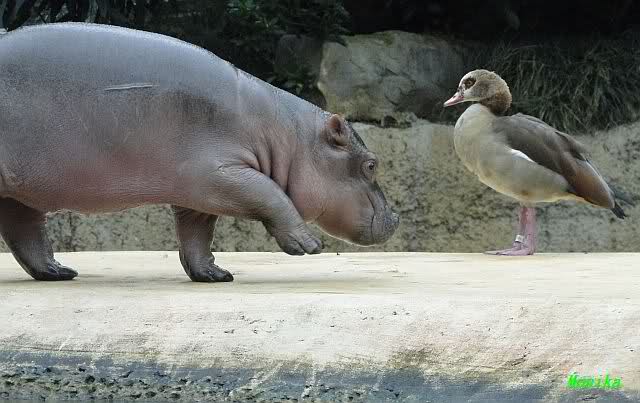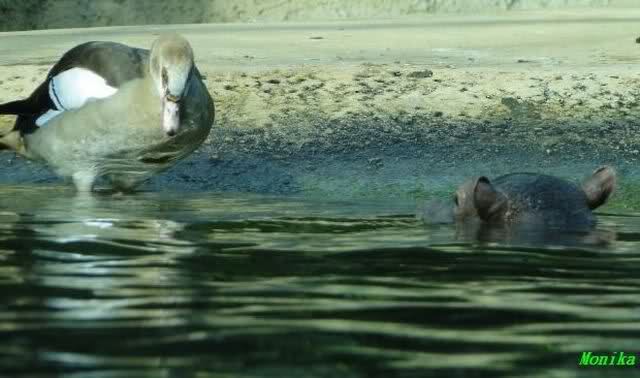 Das kleine Flusspferd guckt fasziniert zur Nilgans.