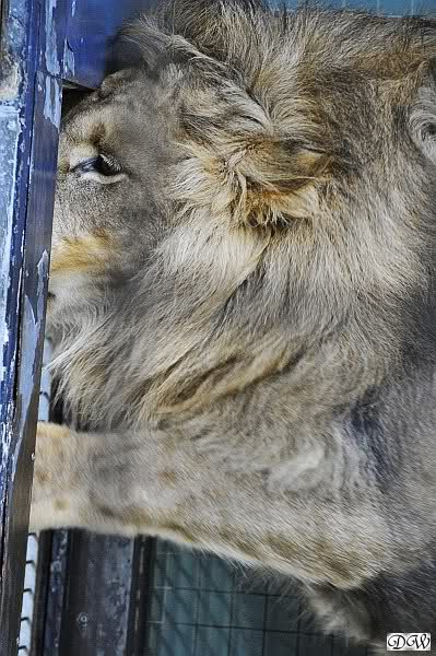 Als wir kurz vor der Schließung noch einmal ins Raubtierhaus kamen, lag Aketi regungslos im Stroh. Aru bummerte an die Tür, die die Käfige trennt. Nach einer Weile stand Aketi kurz auf. Sie lief recht unsicher. Offensichtlich blutet sie noch, denn überall im Stroh war noch Blut zu sehen. Sie legte sich wieder hin und achtete nicht auf das Rufen ihres Bruders. Aus der Wurfhöhle war zu dieser Zeit kein Laut zu hören. Als ich jemanden vom Pflegepersonal darauf ansprach sagte man mir, dass die Kleinen jetzt wahrscheinlich schlafen, denn vor Kurzem hätten sie noch geschrien. Auf meine Frage, ob Aketi die Kleinen versorge, bekam ich ein Achselzucken und die Antwort, dass die Löwin die meiste Zeit im Käfig verbringe. Ob die Babys von den Pflegern gefüttert werden, konnte ich nicht in Erfahrung bringen.