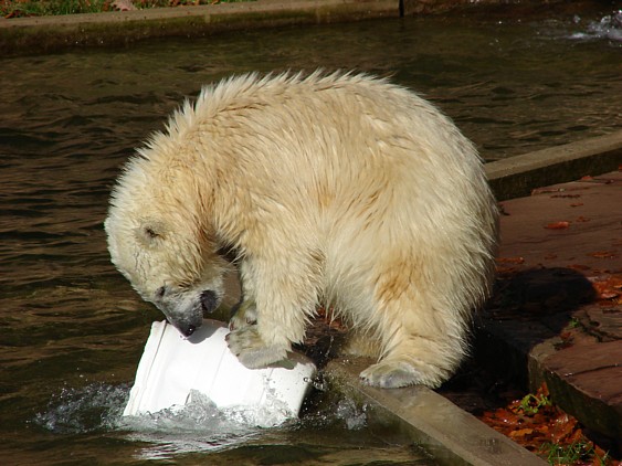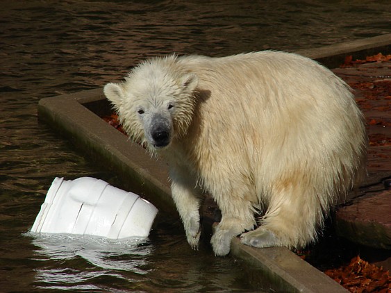 Flocke kam danach wieder ins Gehege und von da an war Spaß angesagt. Witzigerweise scheint Flocke ihr Fleisch lieber zu haben, wenn sie es erstmal tüchtig eingeweicht hat. Sie hat auch, statt das frische Fleisch aufzufressen, immer wieder ältere Fleischreste und Fische vom Grund des Beckens hoch geholt. Ansonsten war sie die meiste Zeit mit ihrer weißen Plastiktonne zugange, die sie unermüdlich malträtiert hat. Auch Besuche an der Zwischentür zu Vera waren wieder angesagt, die von dieser mit Schlägen gegen die Tür und nicht sehr freundlichem Gebrumme quittiert wurden. Flocke schien davon aber nicht wirklich beeindruckt, man gewöhnt sich halt an alles Und was mir heute aufgefallen ist, Flockes Zunge wird langsam blau, das sieht witzig aus, weil es nicht einheitlich passiert, sondern sich Flecken bilden, wie man auf meinen Fotos sehen kann. Ich hab etwa zwei Stunden bei ihr verbracht und als ich gegangen bin, war sie immer noch lustig am Spielen, das Mädchen hat definitiv Energie