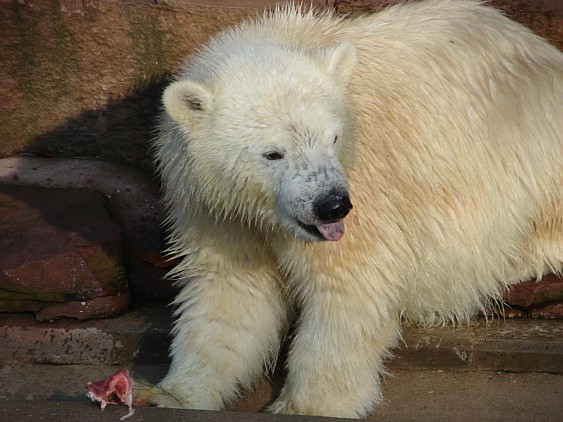 Bei herrlichstem Sonnenschein war ich heute auch wieder im Tiergarten und habe Flocke besucht Als ich ankam, war sie erstmal gar nicht zu sehen. Sie hat sich dauernd in der Nähe des Eingangs zum Stall rumgedrückt, wohl in Erwartung von Futter. Eventuell hat sie dort ein paar Leckerbissen bekommen, weil sie ab und an um die Ecke kam und sich das Maul geleckt hat. Die richtige Fütterung war aber erst für halb 11 geplant. Da wurde Flocke kurz eingesperrt und Harald Hager kam ins Gehege, um Fleisch und Fisch zu verteilen und ein paar von Flockes Hinterlassenschaften zu beseitigen.
