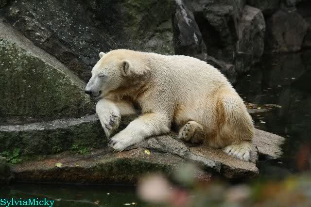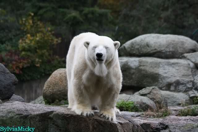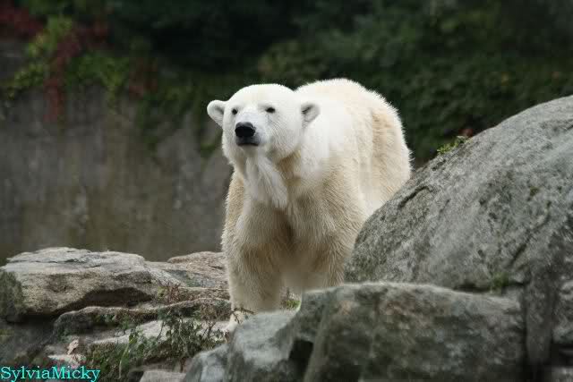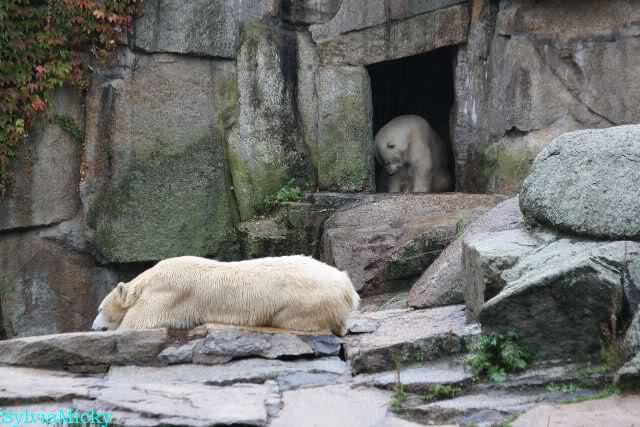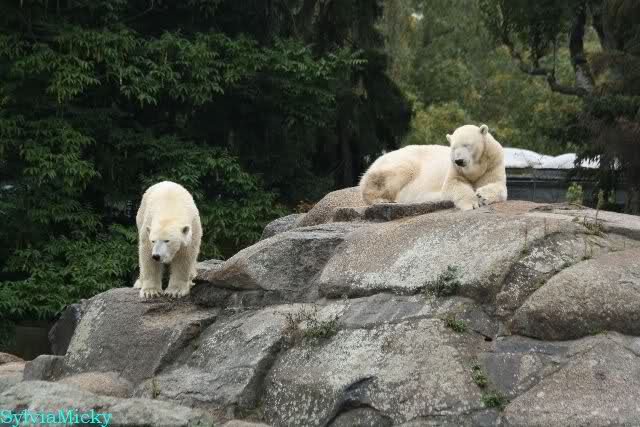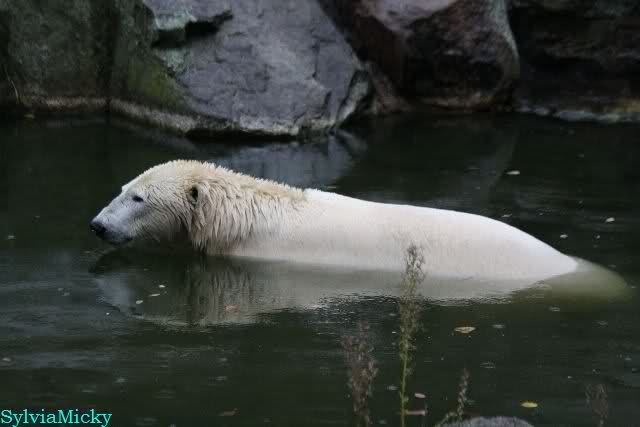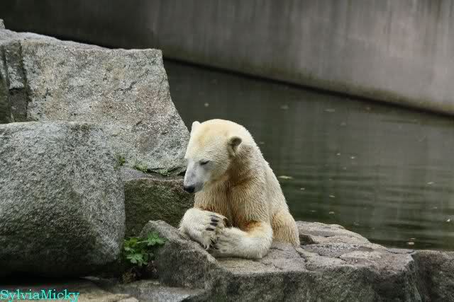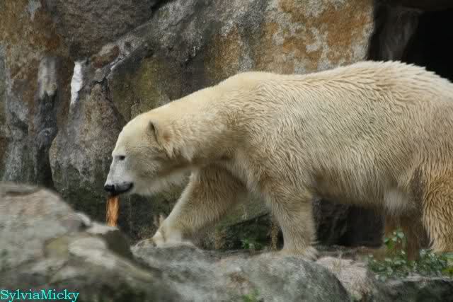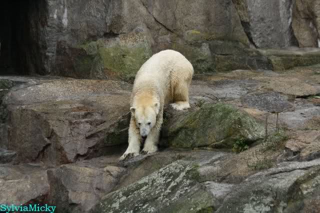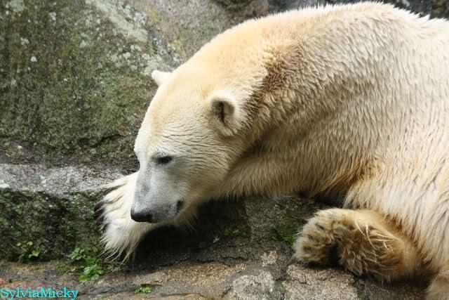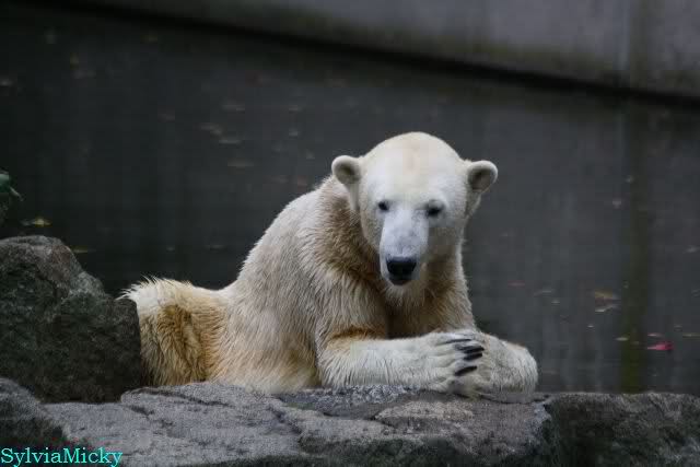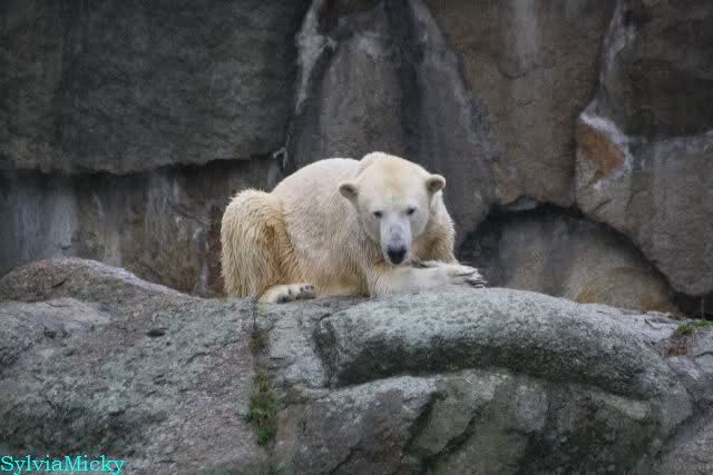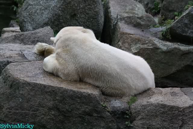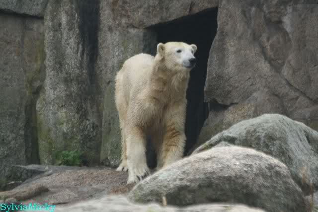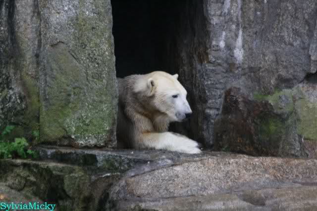 Als ich den Zoo verließ, lag Knut wieder auf seiner rechten vorderen Ecke, Tosca auf der linken Insel, Kati stand in ihrer Höhle und Nancy lag auf der Anlage.