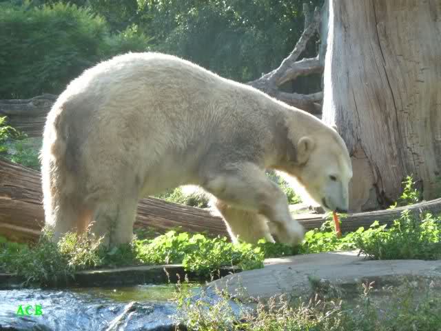 Am Vormittag lag Knut auf dem Stein und schlief. Es scheint sein neuester Lieblingsplatz zu sein. Gegen Mittag schwamm er im Wassergraben. Er spielte erst Ball mit sich. Knut habe ich nicht gesehen aber der Ball flog immer nach oben. Später spielte er auch mit den wieder sehr zahlreichen Besuchern.