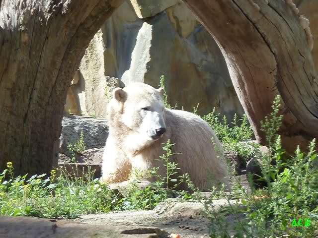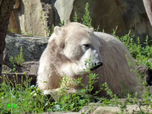 Als wir kurz vor elf den Zoo betraten, begann es zu regnen. Nicht sehr heftig, aber unangenehm. Trotzdem machten wir uns unverdrossen auf den Weg zu Knut. Der hatte sich ordentlich geschminkt, wie es sich gehört und lag schlafend in seiner Kuhle. Er hatte an uns wenig Interesse. Das machte nichts; auch mein Enkelsohn hatte kein Interesse. Er schlief nämlich. Naja, was nicht ist, kann ja noch werden.