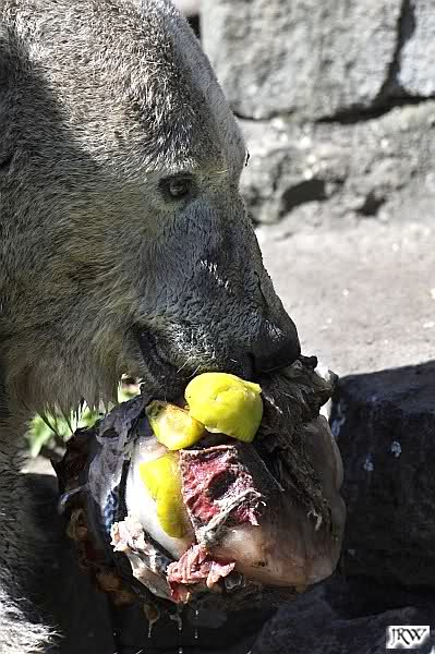 Eine Knutfreundin hatte eine Eisbombe für Knut liebevoll zusammengestellt. Es war erstaunlich, was er immer wieder Neues mit einer Eisbombe anstellen konnte. Er knabberte daran, trug sie herum und letztendlich wälzte er sie im schwarzen Sand. Besucher, die später kamen, konnten nicht erkennen womit er spielte, so schwarz waren die Überreste geworden. Seine Pfote, mit der er sie ein- und wieder ausbuddelte war rabenschwarz. Er beschäftigte sich stundenlang mit seinem Geschenk. Irgendwann trug er die Reste der Eisbombe zum Wasser, spülte sie ab und verspeiste den Rest. Das war typisch Knut. Eben ein Zauberbär!