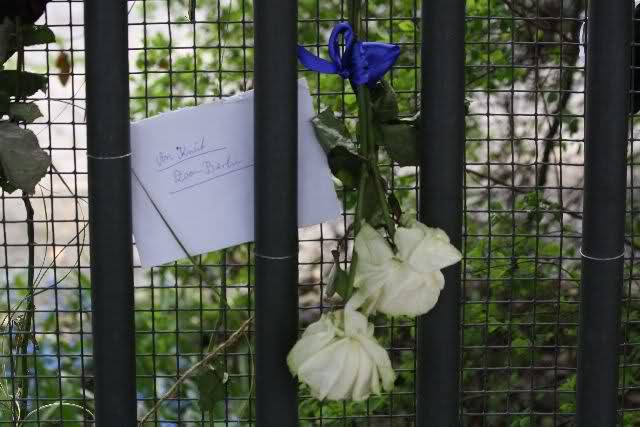 Gegen 18.00 Uhr legte eine Besucherin aus Darmstadt ein Blumengesteck vor der Scheibe ab.