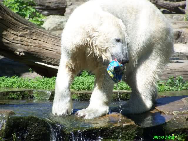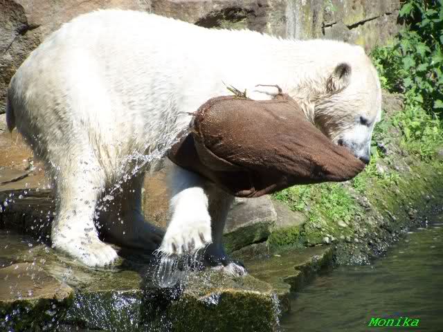 Heute Vormittag war Knut im Wasser und spielte mit seinem Nackthuhn und dem Schlauch. Dann fischte er einen gefüllten Jutesack aus dem Wasser, der solange bearbeitet wurde, bis der Inhalt zum Vorschein kam. Ein schon ziemlich zusammen gepresster Ball, der aber schwungvoll zu den Zuschauern geflogen ist.