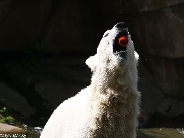 Knut indessen jieperte nach seinem Futter, dass ihm dass Wasser im Mund zusammen und auch heraus lief. Er lebte heute auch wieder sehr gut, so wie immer. Fleisch, Fisch, Weintrauben, Birnen, Bananen und ein halbes Rosinenbrot. Zwischendurch wurde Frau Weckert immer noch das eine oder andere Brötchen oder Croissant gereicht, dass dann auch im Bärenmagen verschwand. Den Höhepunkt bildete ein großer Fisch, vielleicht von dem netten Herrn, der mittwochs immer einen Fisch mitbringt?
