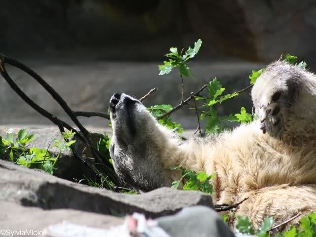 Bei den Braunbären saß Berni heute auf seinem Allerwertesten, die Hinterbeine ausgestreckt, und wartete darauf, dass ihm die Pflegerin etwas in den Schoß warf. Was daneben fiel, wurde zunächst ignoriert. Nur nicht zuviel bewegen! Ruhe ist dem Bären heilig. Aber dem alten Herrn mit seiner Arthrose kann man das schon nachsehen.