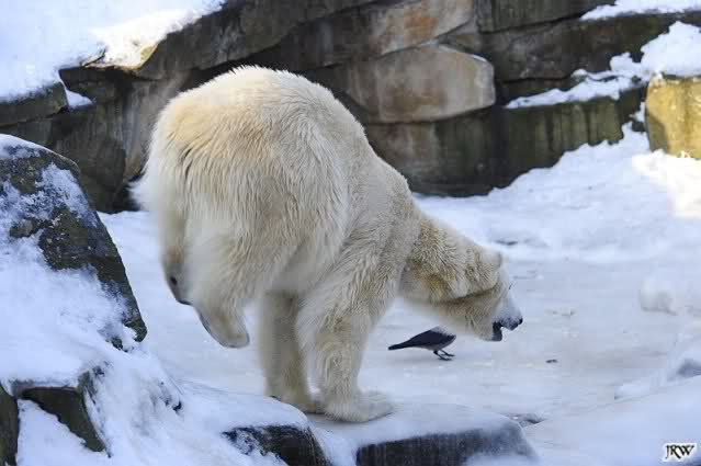 Wenn’s weiter so frostig bleibt, sollte ich vielleicht doch unserm Weißbär, äh Eisbär Knutili mal endlich einen Besuch abstatten. Bei diesen Temperaturen müßte er eigentlich aufleben und vor Lebensfreude nur so quietschen. Echtes Knut-Wetter eben, aber immerhin heute mit ausgiebig Sonnenschein. Stelle mir vor, daß der beliebteste Berliner derzeit weltweit, wie naarrisch im Schnee herumtoben wird, irgendeim komischen Gegenstand hinterherrennt, eim Eimer, eim Weihnachtsbaum oder eim alten, löchrigen Sack, denn der Schnee dürfte bei ihm starke Sehnsuchtsbilder nach der nie gekannten Urheimat auslösen, nämlich nach dem alles überdeckenden Weiß, in dem er dann fast vollständig aufgeht, weil er mit dem Weiß ringsum verschmilzt, ja Teil wird und sich damit nicht mehr nackt fühlen muß - denn in hiesigen Breiten bleibt für gewöhnlich für alle auf weite Entfernung bestens erkennbar wie ein weißer Pudel.