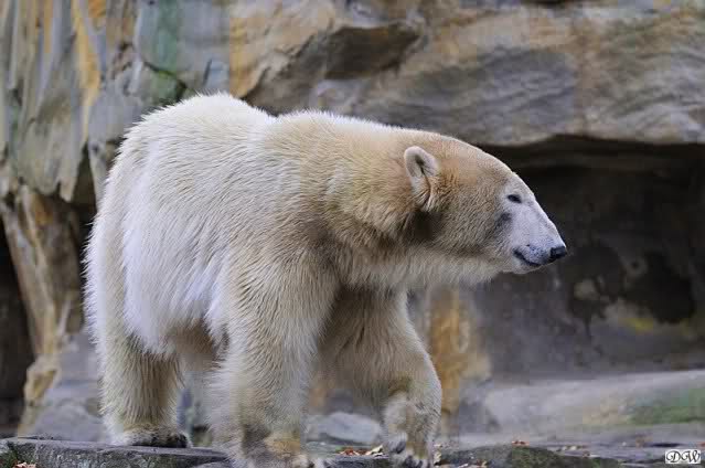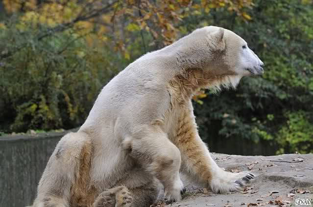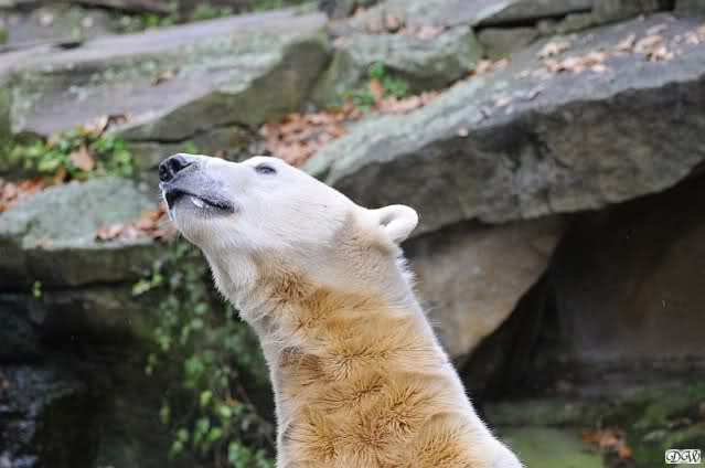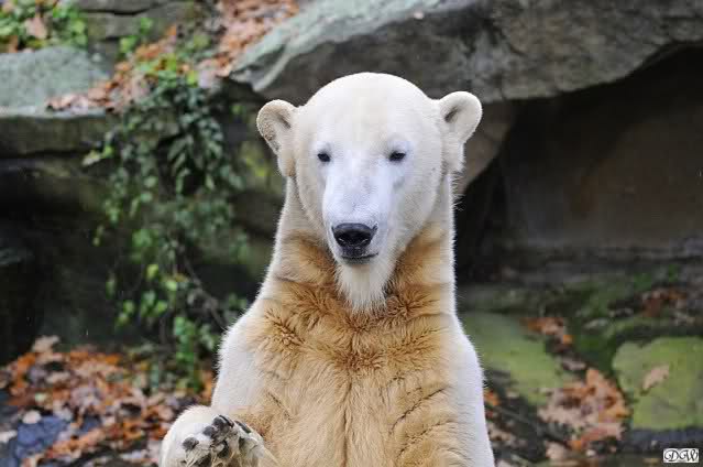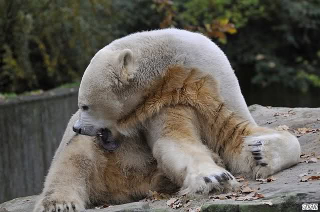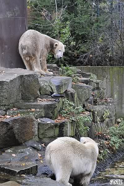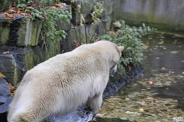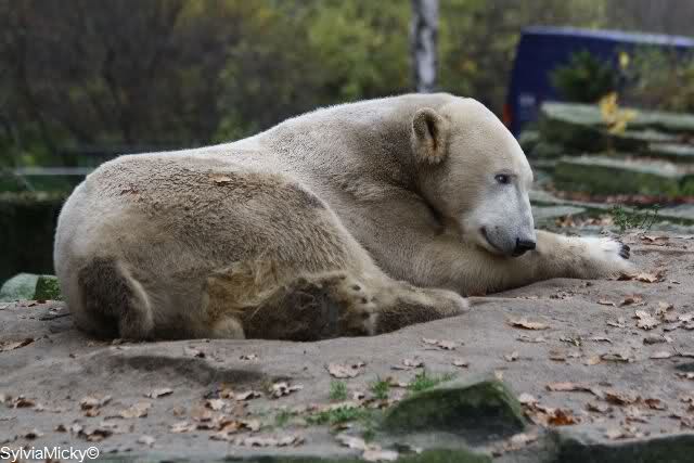 Heute Vormittag schmusten Knut und Gianna lange miteinander. Sie im Wasser und er oben. Gegen Mittag lag Knut auf dem inzwischen betoniertem Sandhügel und Gianna unterm Baum. Nach der Fütterung dauerte es ewig lange, bis Gianna ins Wasser ging. Knut betrachtete sie völlig erstaunt und setzte sich auch mal hin, weil es ihm zu lange dauerte. Gianna versuchte wie Knut das Restfutter mit der Pfote ran zu holen.