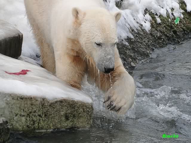 Knut hat sehr lange Krallen. Er schaffte es aber nicht den eingefrorenen Fetzen raus zu kratzen.