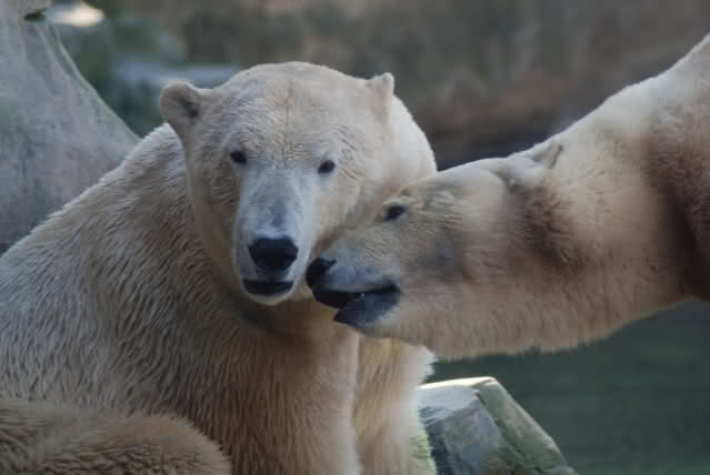Die beiden Eisbären Lloyd und Viktoria im Zoo Am Meer in Bremerhaven hat sich inzwischen auch erfolgreich und positiv beschnuppert und mögen sich.