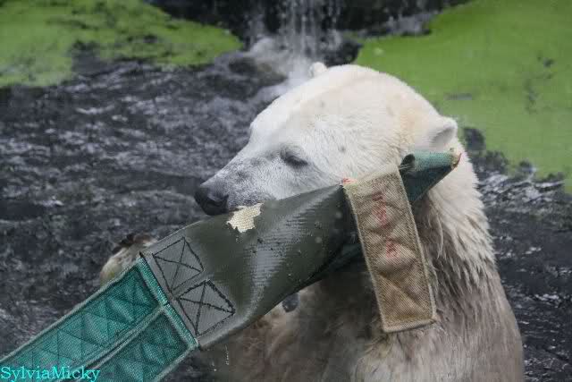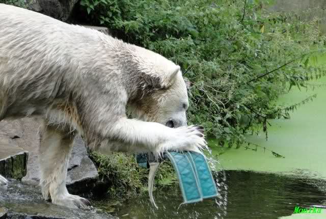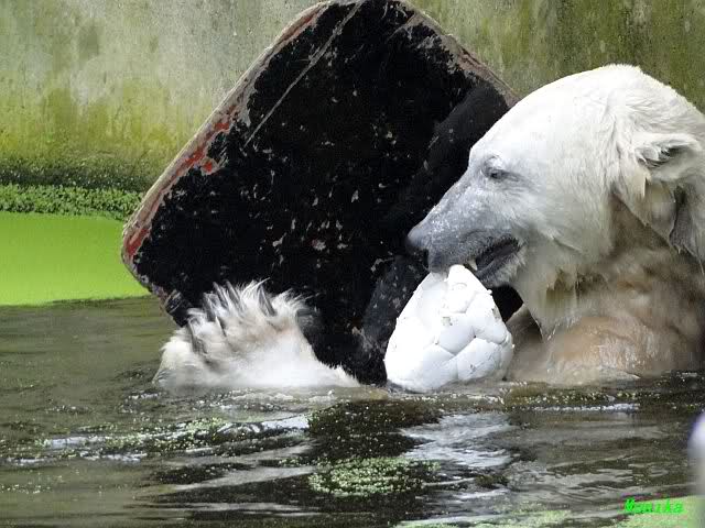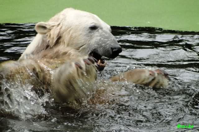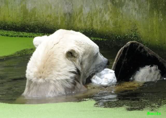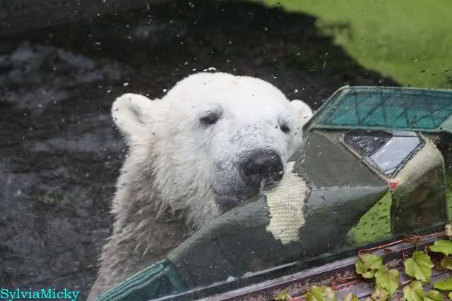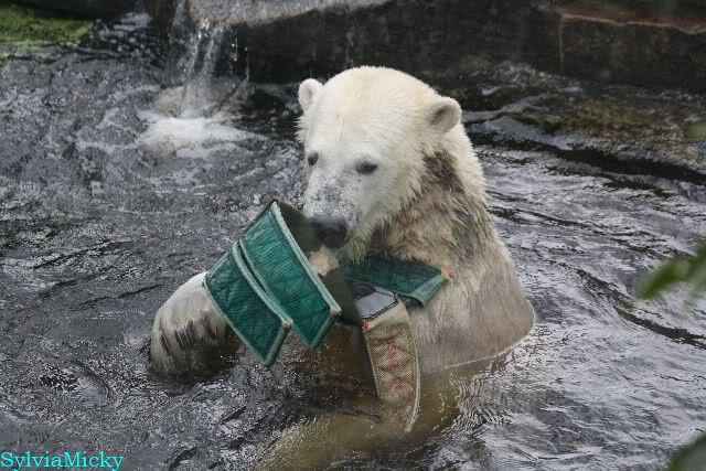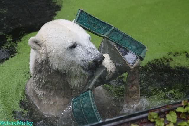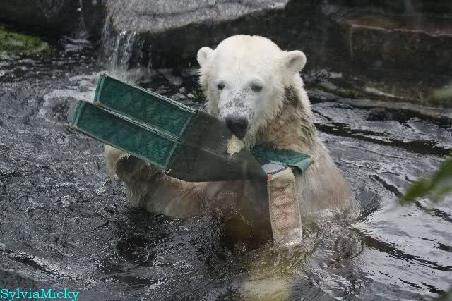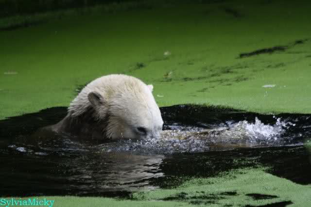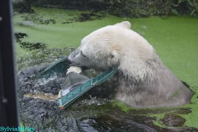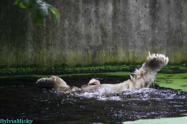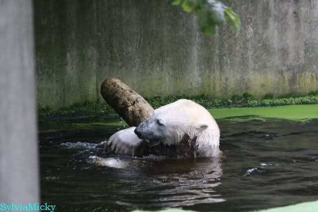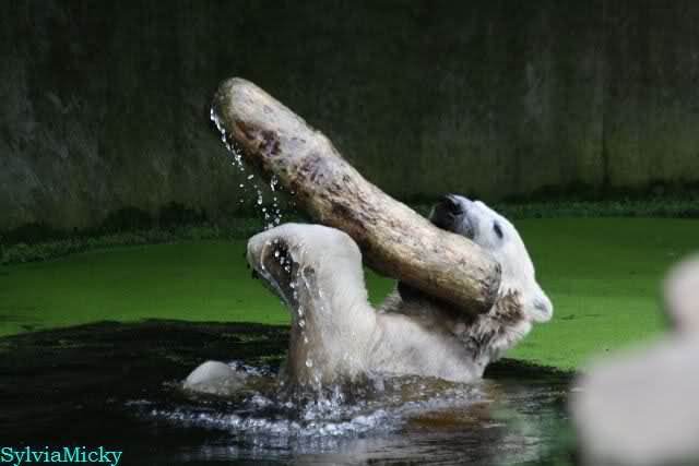 Als ich am Vormittag in den Zoo ging, war Knut schon im Wasser und tobte mit dem Baumstamm, Ball, Rest Ochsenschwanz und Huhn. Als ich gegen Mittag den Zoo verließ war Knut immer noch im Wasser.