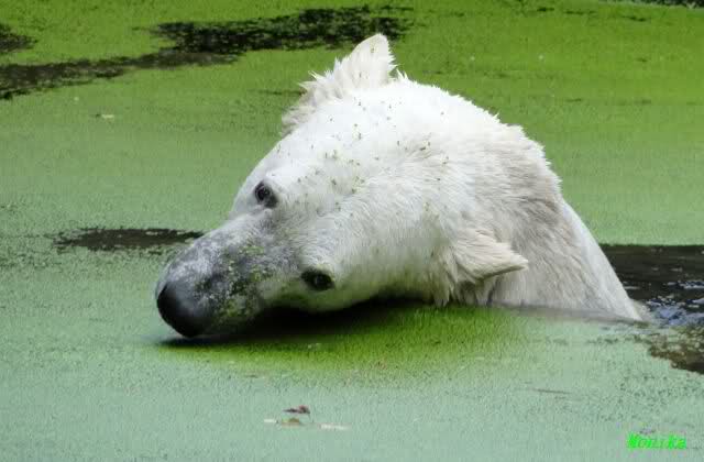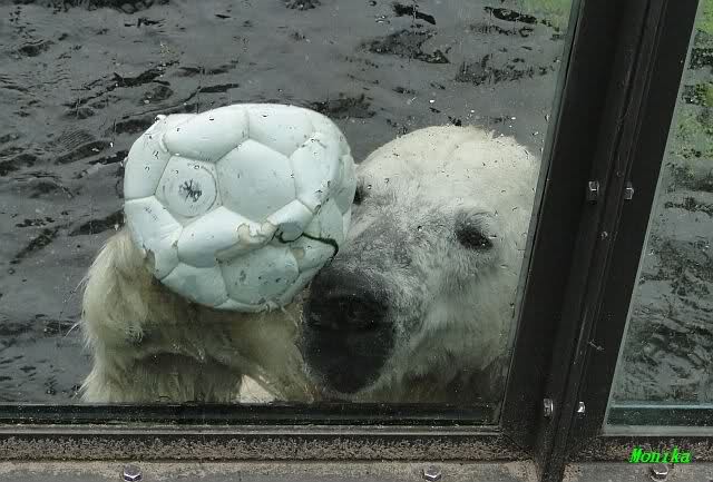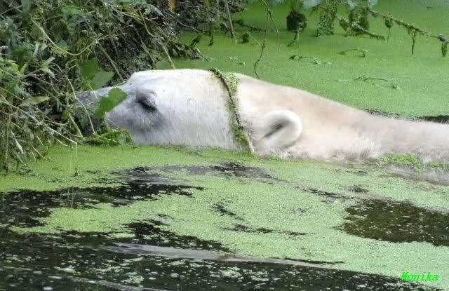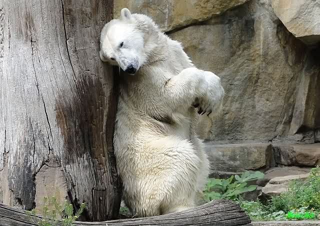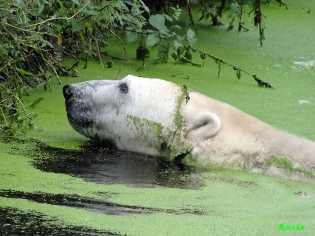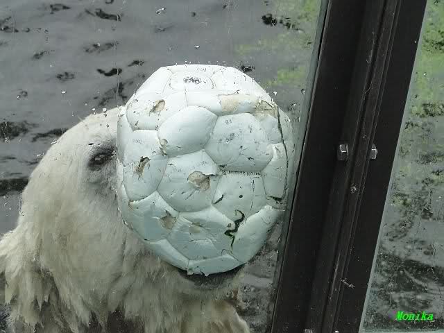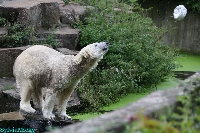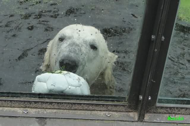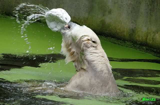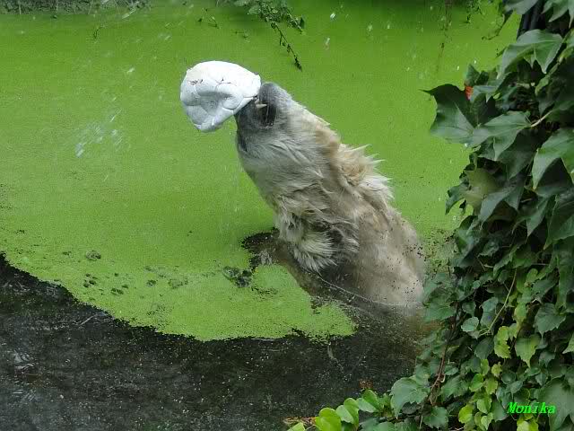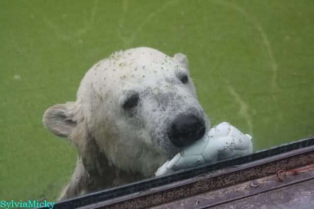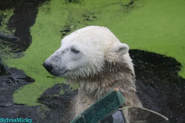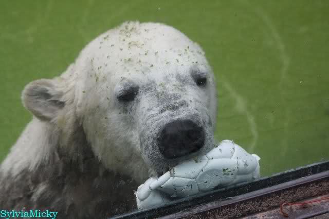 Als ich am Vormittag in den Zoo ging, war Knut schon im Wasser und tobte mit dem Baumstamm, Ball, Rest Ochsenschwanz und Huhn. Als ich gegen Mittag den Zoo verließ war Knut immer noch im Wasser.
