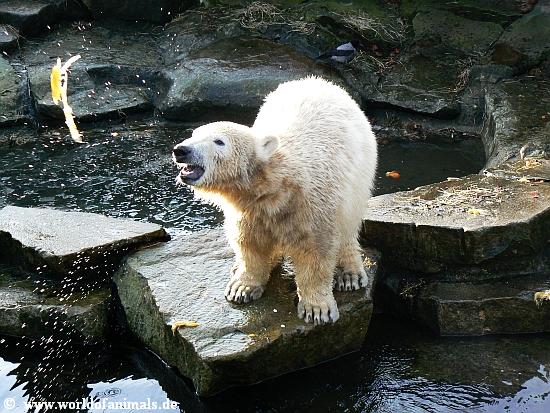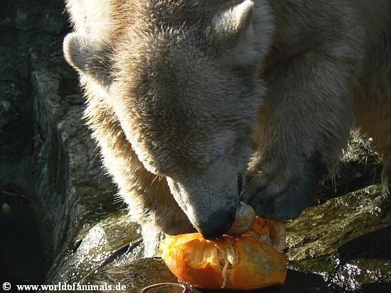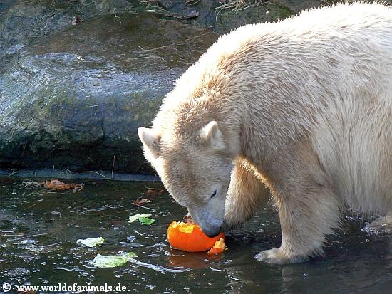 here are my nect pictures from Knut at sunday afternoon. He did play in water. But before that, he got his food: Fish, apple, croissants, pear, wine grapes, and a little pumpkin....