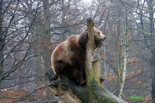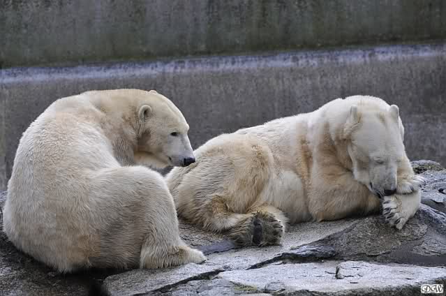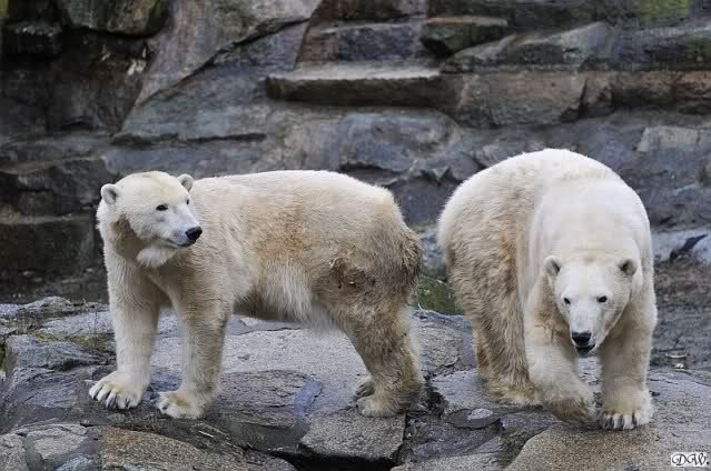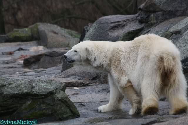 Als ich nach Knuts Fütterung bei den Großen stand, standen Tosca und Nancy auf dem Felsen und Katjuscha lief über die Anlage.
