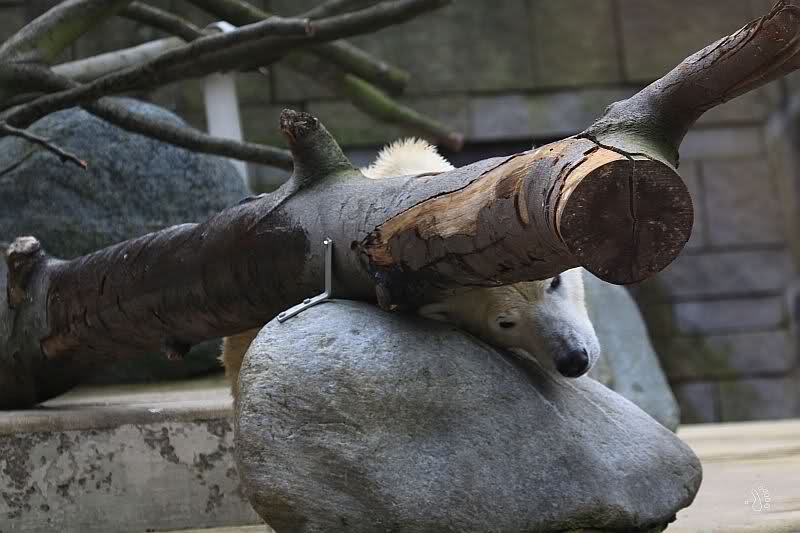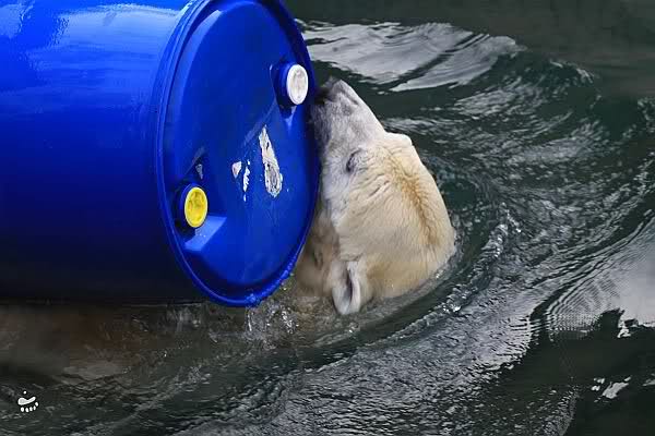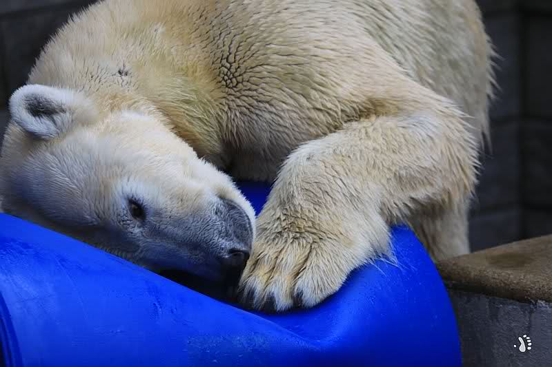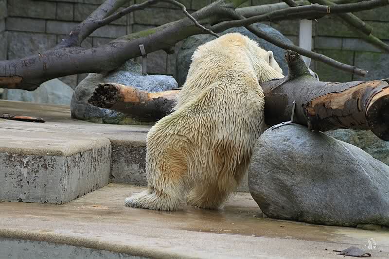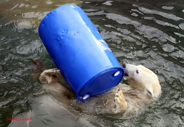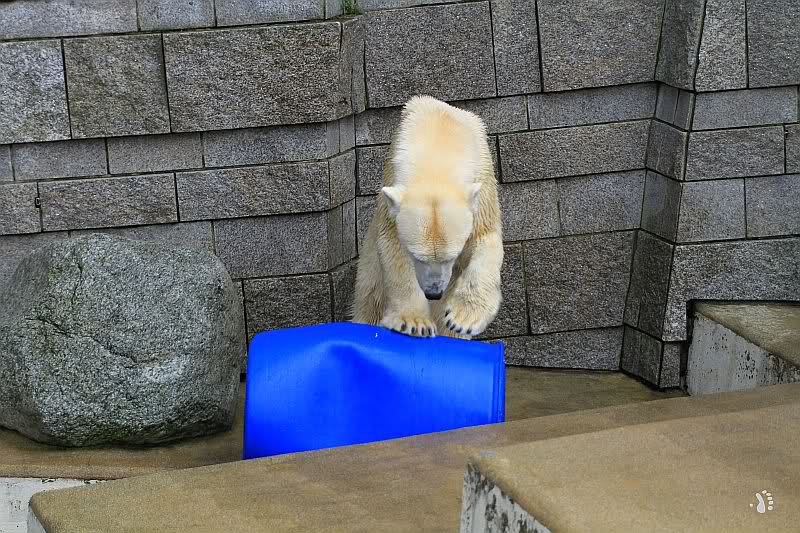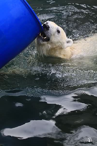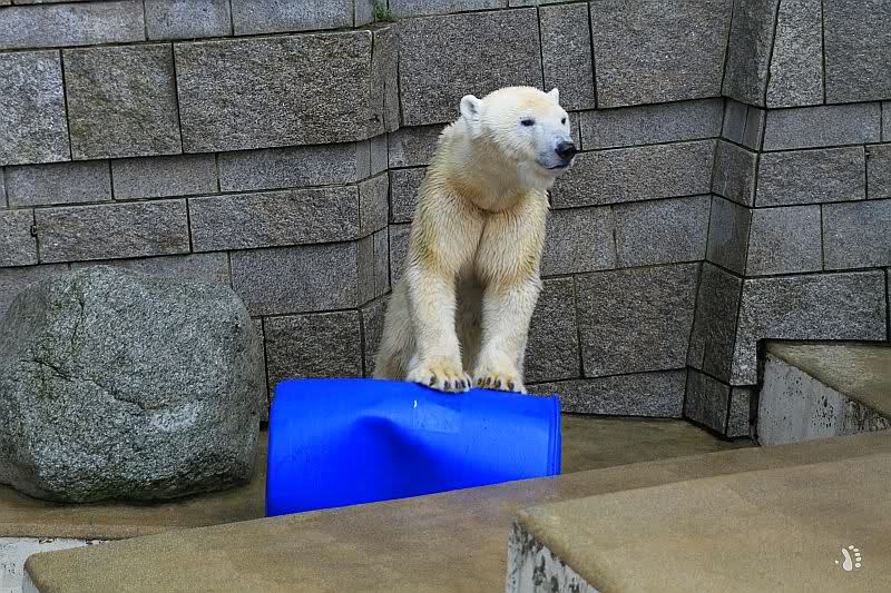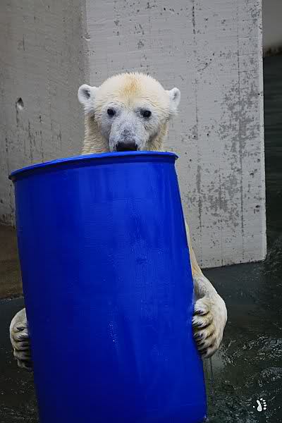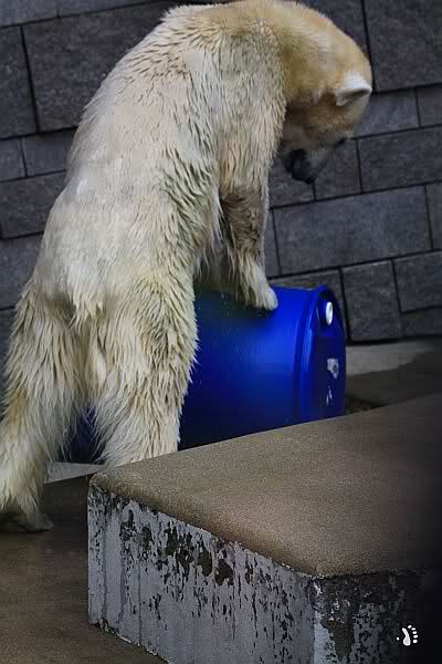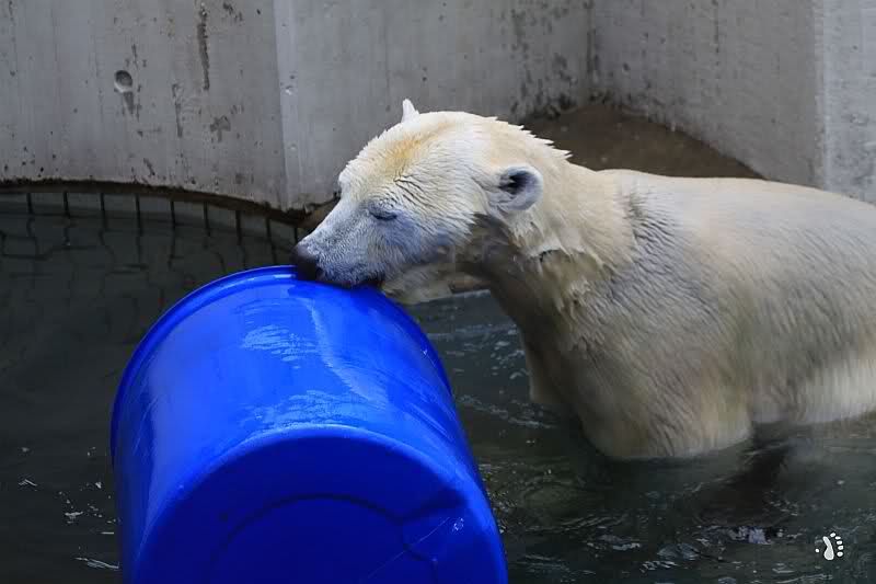 Lars ist ein erfahrener Eisbärmann und weiß, dass er keine Chance hat an die Tonne zu kommen, solange Vilma diese bearbeitet.