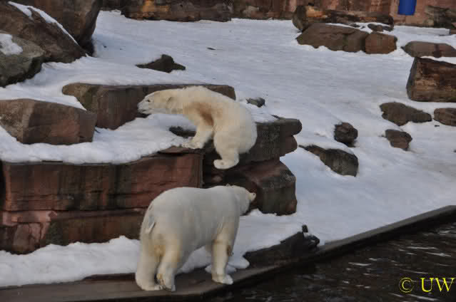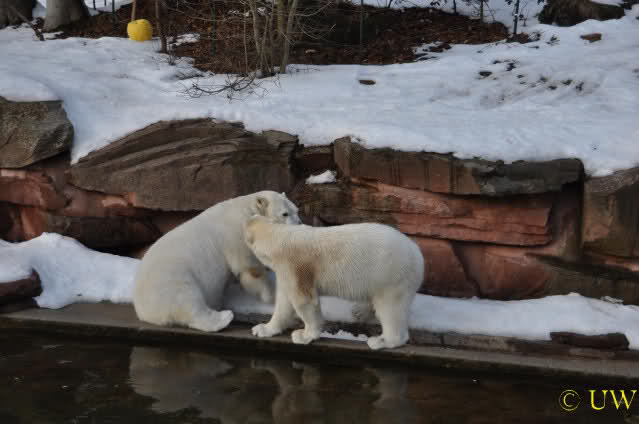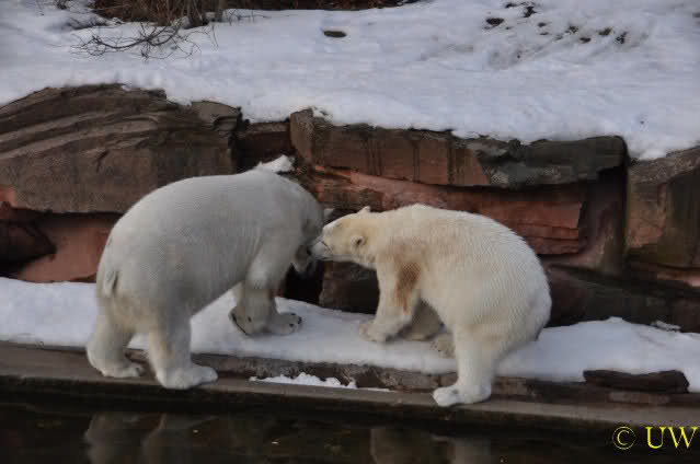 Die beiden passen sehr gut zusammen und bei Eisbären geht es schon etwas derber zu, insofern kannst Du sogar Recht haben, dass Flocke schmusen will. Hin und wieder langt sie da aber auch kräftig hin bzw. beisst ganz kräftig - aber Eisbären halten das aus.