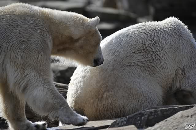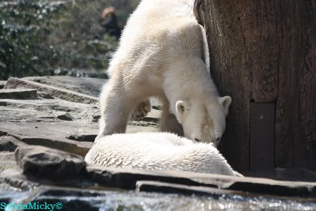 Einige Zoobesucher befürchteten, daß Knut rüber springt. Dann schwang Iglu das eine Bein über den Zaun. Es ging dann eine Stammbesucherin zu ihm hin und sagte, er solle dies unterlassen.