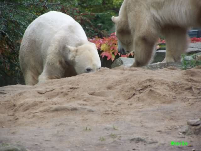 Meine "Hexe" ist zwar noch nicht so ganz verschwunden, aber es zog mich heute trotzdem in den Zoo. Mit etwas "Schmerz-Doping" ging es dann auch einigermaßen. Heute Vormittag war es sehr ruhig bei unseren Bärenkids. Beide dösten vor sich hin. Knut schien mir heute doch etwas nervös, lag oft mit angelegten Ohren da. Und dann wieder der Baulärm vom Bärenhof! Knut bekam heute wieder einen Kürbis zum Lunch. Er hatte ihn gerade zwischen den Zähnen, als Gianna rauskam. Sie schnappte sich erstmal einen Apfel, den sie oben im kleinen Pool fand, und verfolgte anschließend Knut mit seinem Kürbis. Er ließ ihn dann irgendwann wieder fallen, und Gianna fraß ein wenig davon. Das Spielchen dauerte ein paar Minuten. Der Kürbis, oder besser gesagt, die Reste davon, gingen zwischen beiden immer hin und her. War niedlich anzusehen.