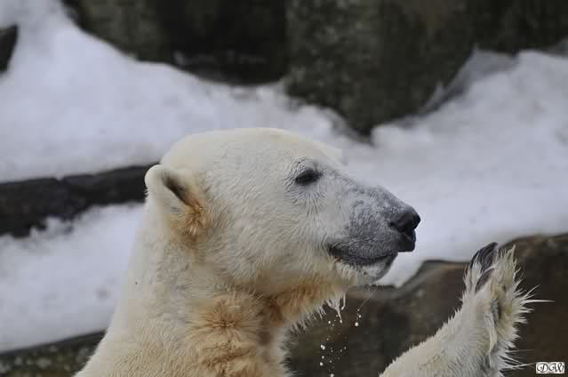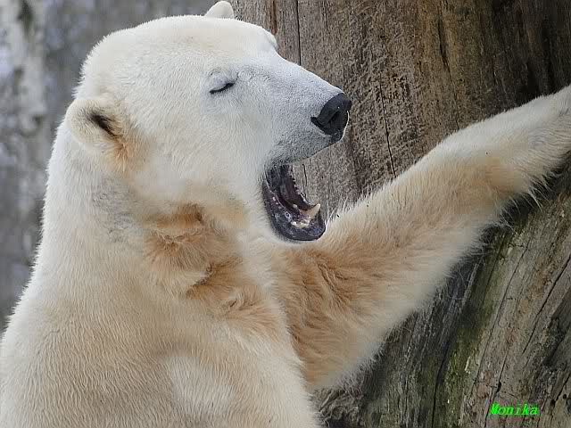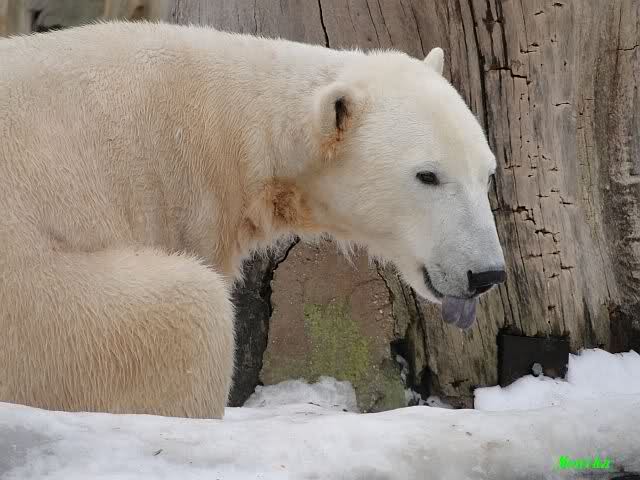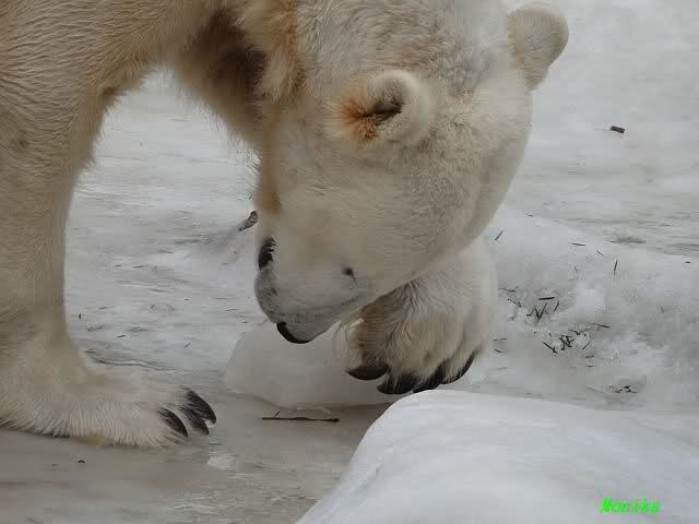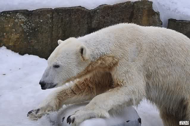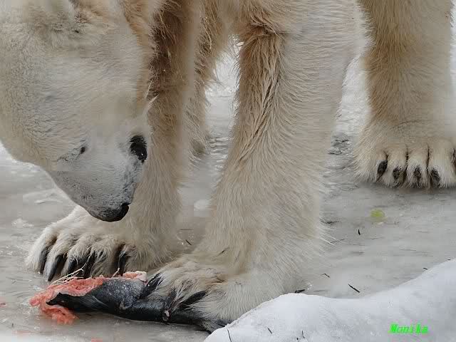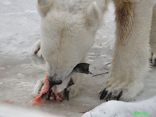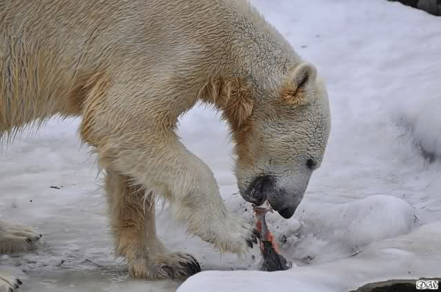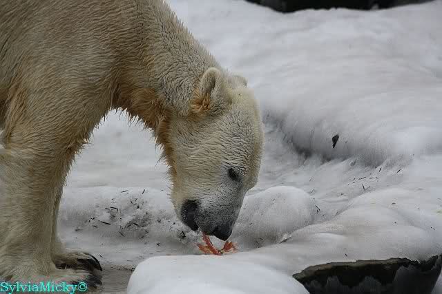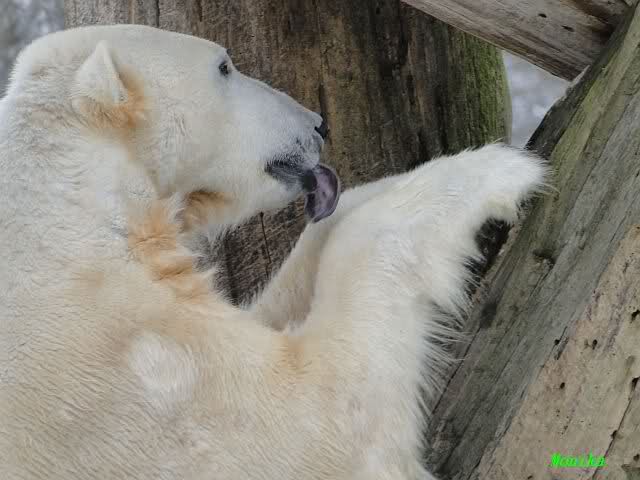 Ich ging zur Fütterung der „Großen“ so wie immer. Die machte gestern wieder der nette Pfleger aus dem Affenhaus. Er wurde von einem jungen Mann begleitet, vermutlich einem Azubi. Der Pfleger versuchte, den Eisbärendamen ein bisschen Bewegung zu verschaffen, indem er das Fleisch weit auf die Anlage warf. Die drei Schönheiten hatten auch recht guten Appetit.