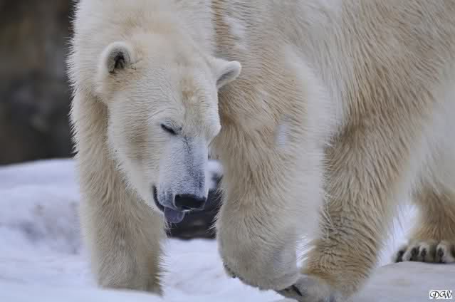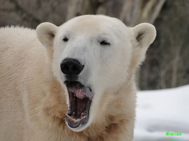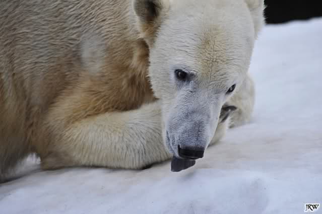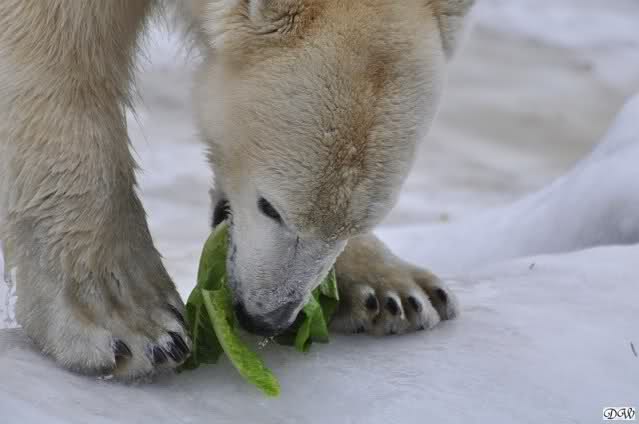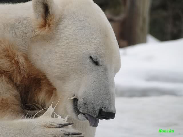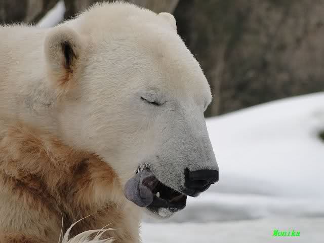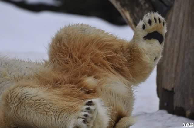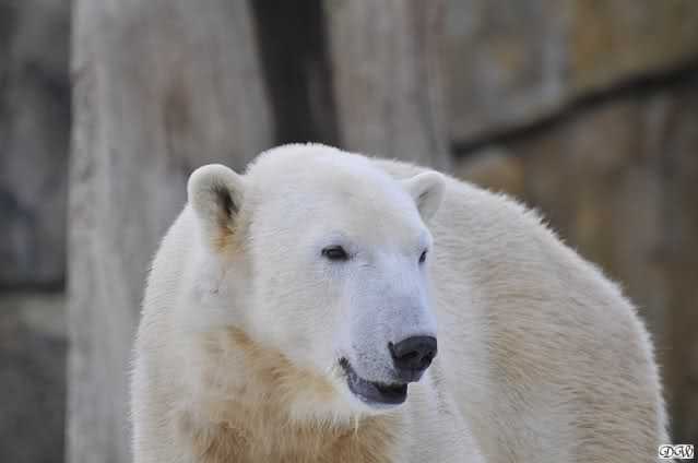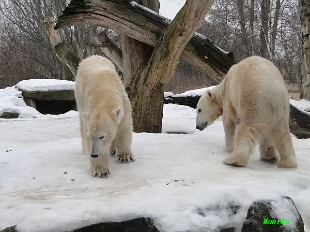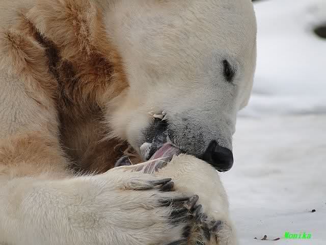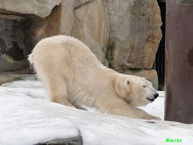 Ich ging zur Fütterung der „Großen“ so wie immer. Die machte gestern wieder der nette Pfleger aus dem Affenhaus. Er wurde von einem jungen Mann begleitet, vermutlich einem Azubi. Der Pfleger versuchte, den Eisbärendamen ein bisschen Bewegung zu verschaffen, indem er das Fleisch weit auf die Anlage warf. Die drei Schönheiten hatten auch recht guten Appetit.