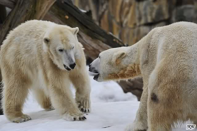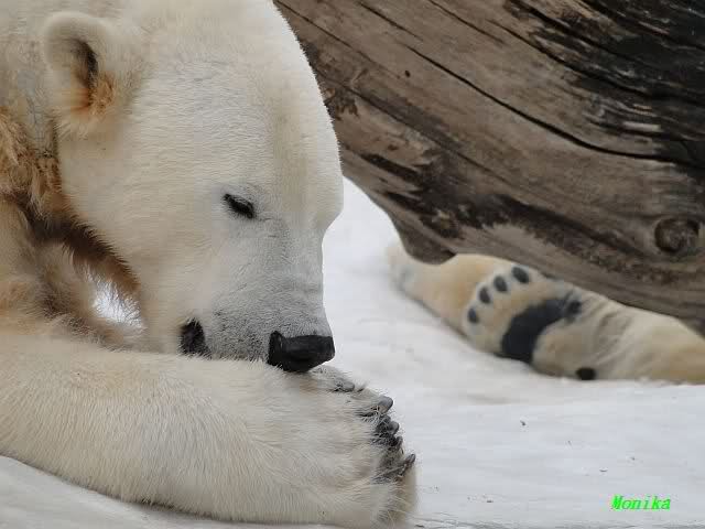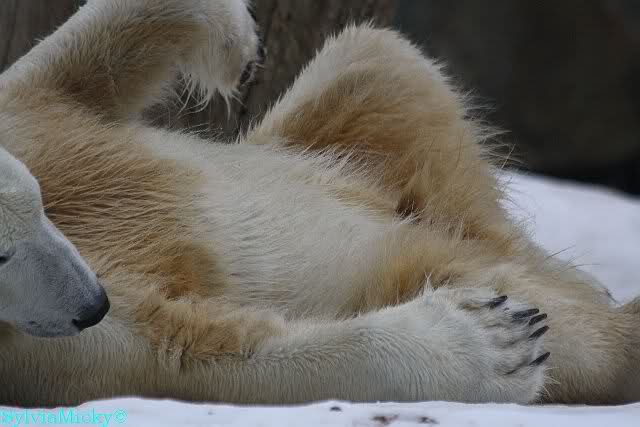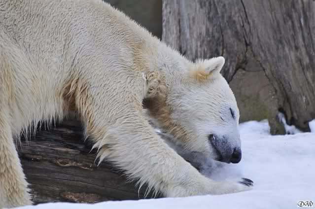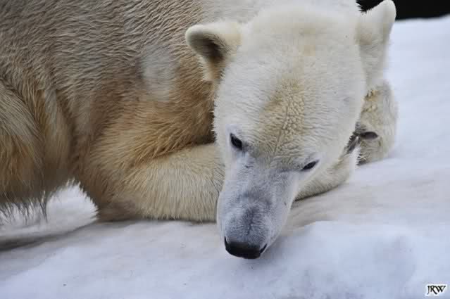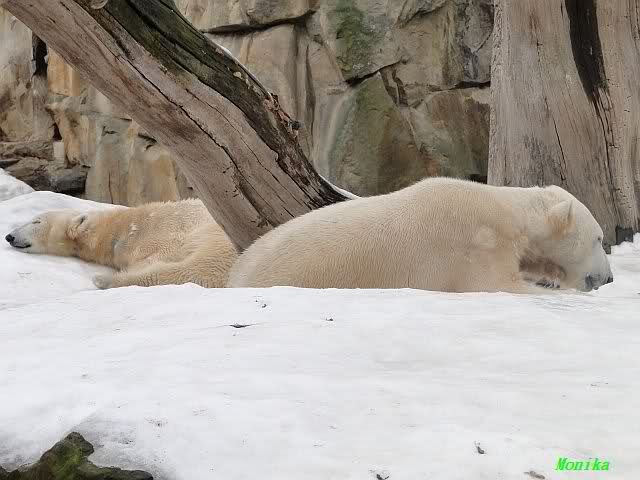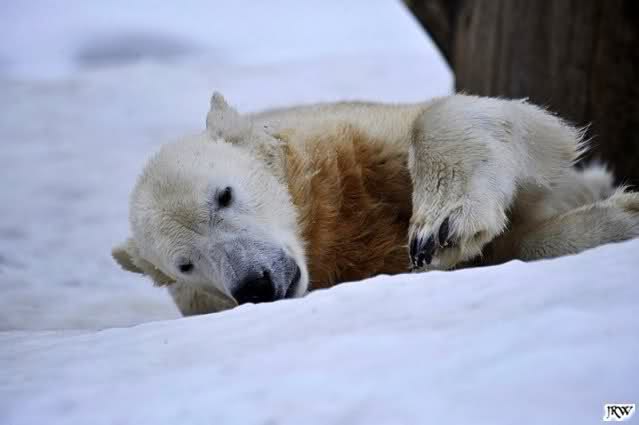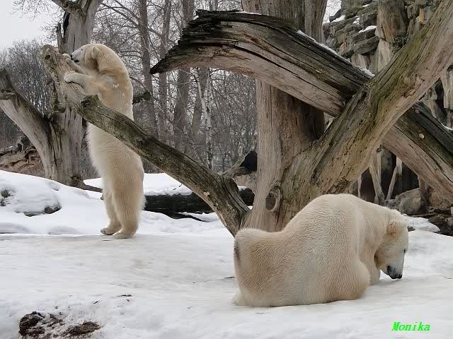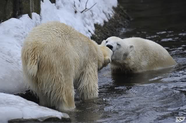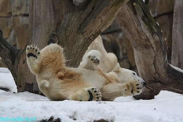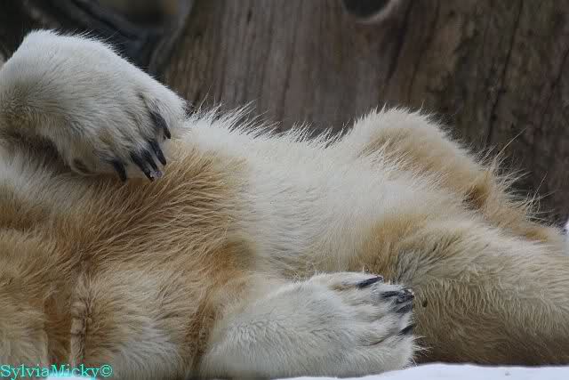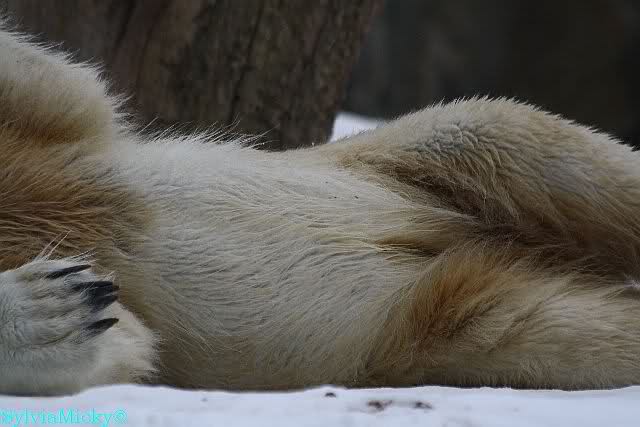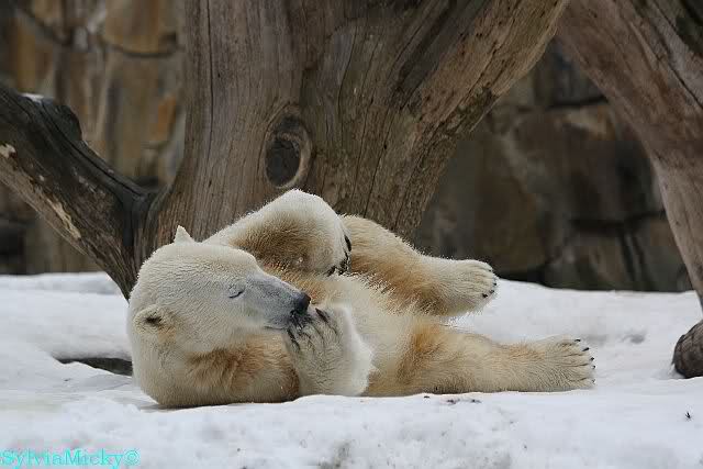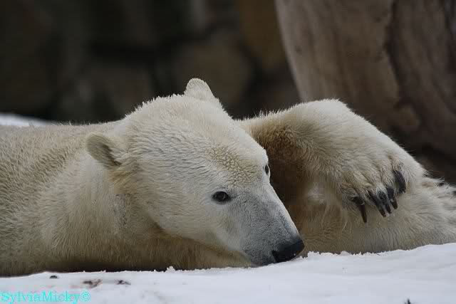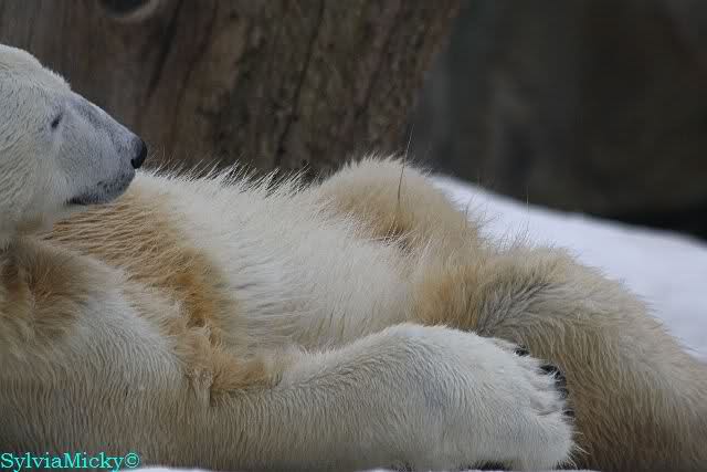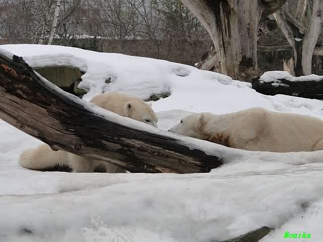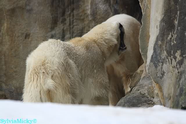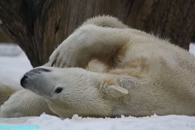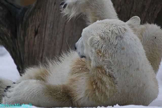 Bei den Eisbärinnen kuschelten Tosca und Nancy miteinander. Katjuscha war – wie so oft – außen vor. Aber vielleicht ist sie gern mal allein.